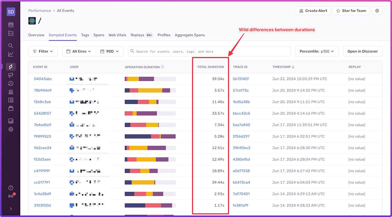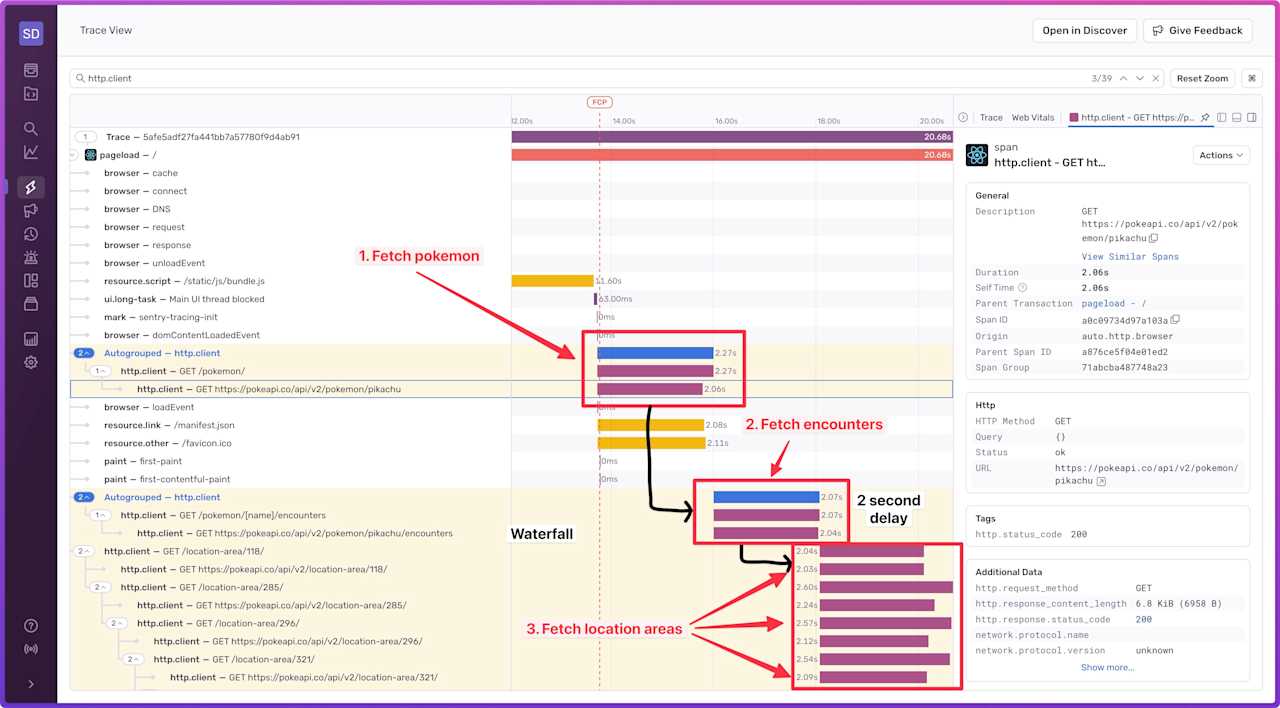 root.render(<App />);The best part about the Sentry SDK is that it automatically instruments the majority of your codebase for you. It automatically wraps known operations like fetch with spans and sends them to your Sentry instance so you can immediately start inspecting the data.