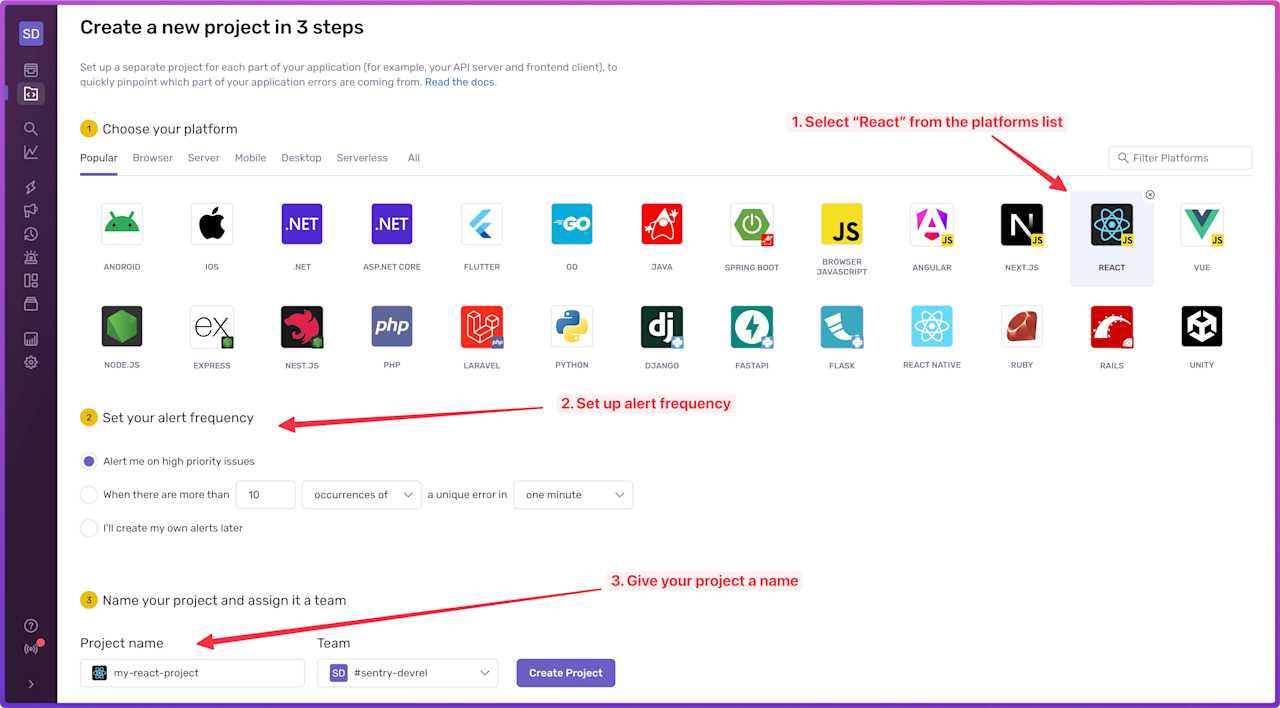 npm install @sentry/reactAt this point, you should already be signed up. Let’s create a new React project: