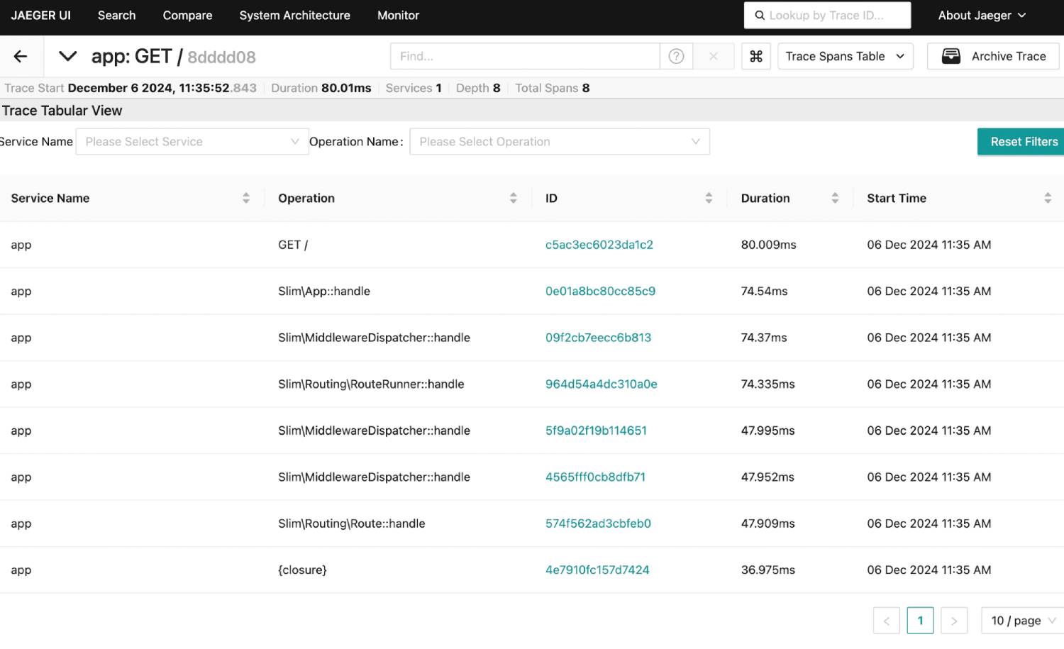 $app->run();Unlike profiling with SPX, OpenTelemetry only outputs traces, and it doesn’t display them. The simplest tool to collect and display the traces is Jaeger. We’ll run Jaeger in a separate Docker container.