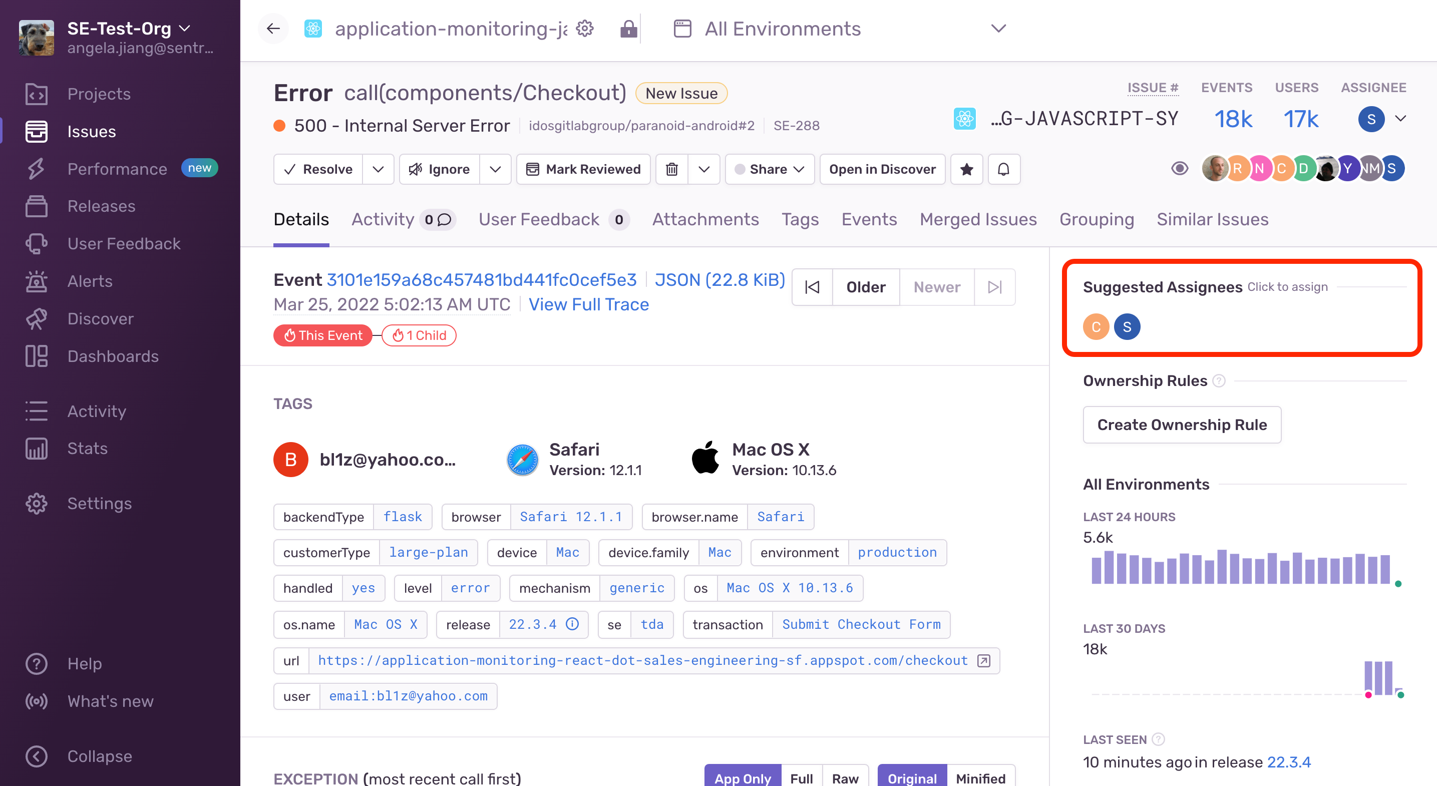 With the GitHub CODEOWNERS file synced to Sentry’s Code Owners rules, Sentry not only captures the issue impacting users, but also surfaces the specific commit related to the issue and automatically suggests the right team member to triage the issue. Gone are the days when you have to scramble to figure out who is responsible for what when critical outages occur.