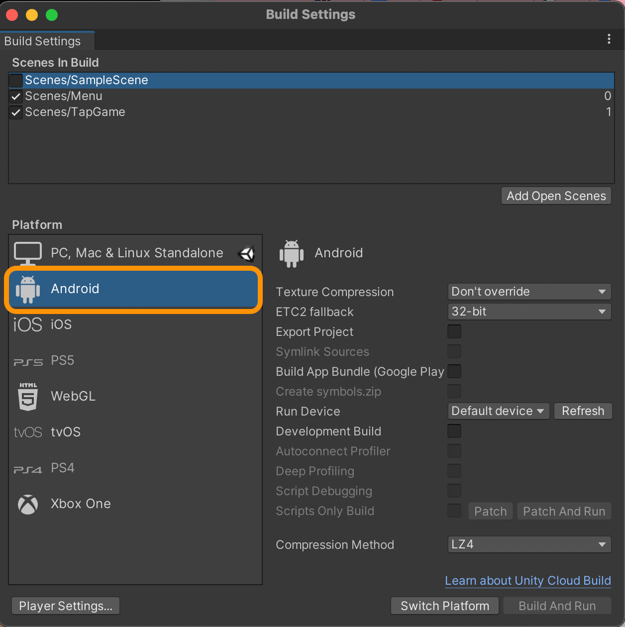 The default for a Unity game is “PC, Mac & Linux Standalone”, so we need to switch to the Android platform. Return to the build settings window and click on Switch platform.