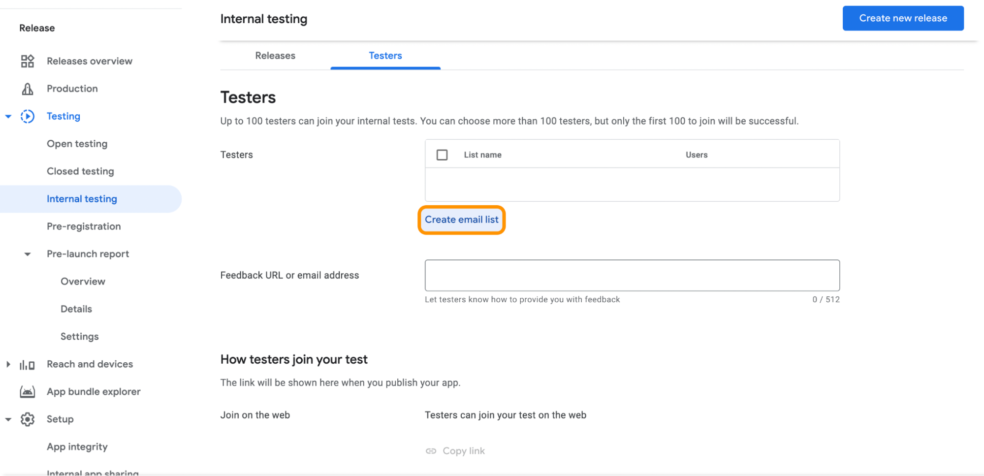 Internal Testing, where you test with up to 100 internal testers (this is what we'll do).