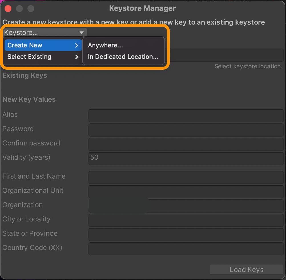 Let’s create a keystore by clicking on the Keystore dropdown > Create New, and save somewhere for referencing later.
