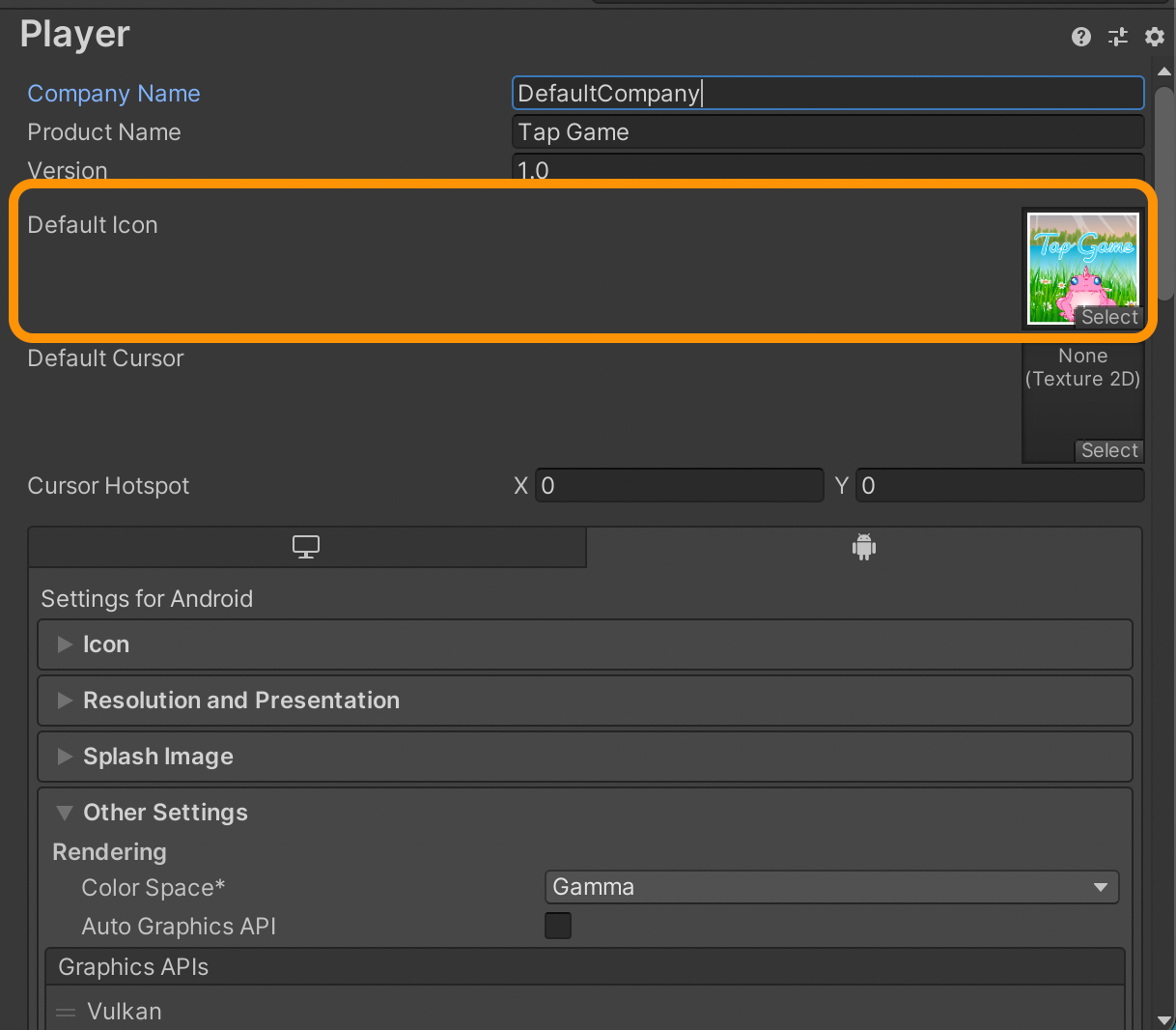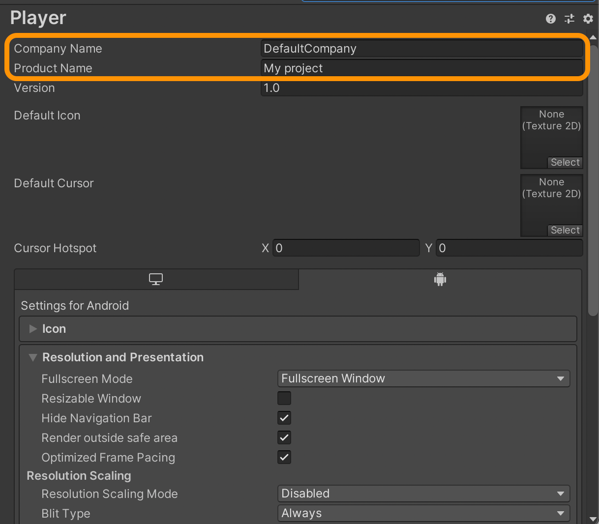 Let’s return to the Player Settings and finish setting up the application. First, write the “Company Name” and “Product Name” as shown below. You won't be able to change these after you upload the game, so make sure you're pleased with your name(s).