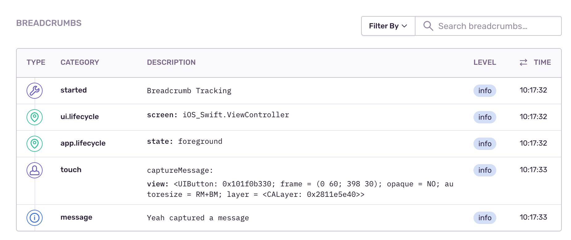 In case you want more context on what happened before an issue, you can take a look at breadcrumbs, which are very similar to traditional logs. Our SDKs can automatically record breadcrumbs, but you can also add them manually.