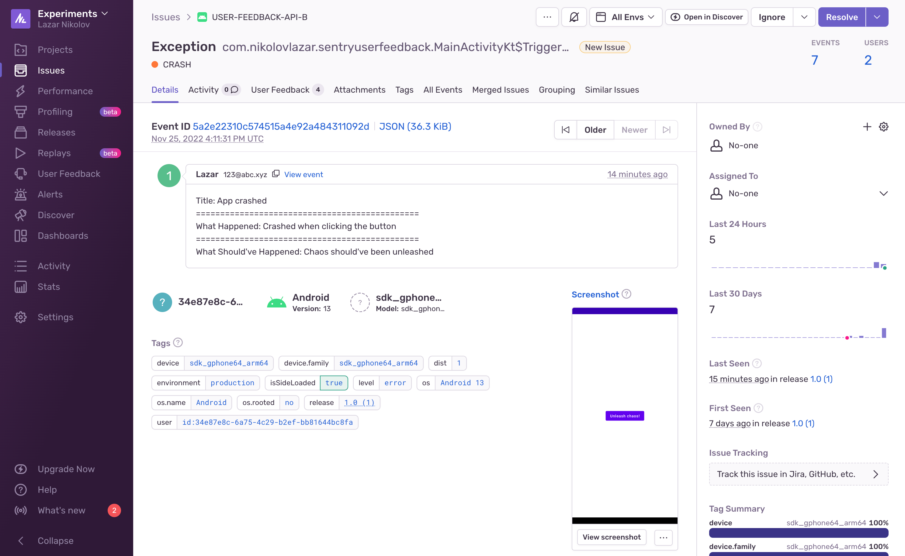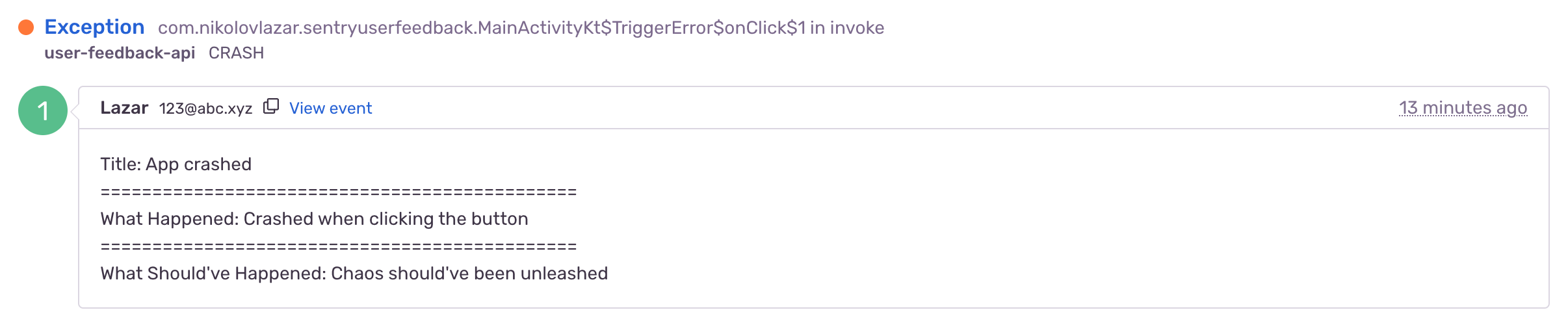 }The sendFeedback method uses the eventId and the local form field state variables to create a new UserFeedback instance. Since the UserFeedback accepts just a comments property, we’re concatenating some of the values, like the title, what happened, and what should’ve happened form field values. Then, using the captureUserFeedback method we’re sending the user’s feedback to Sentry, which is going to be linked with the previous exception that we reported. We can run the app now, fill up the form and open our Sentry dashboard. In the User Feedback screen we will see our feedback showing up: