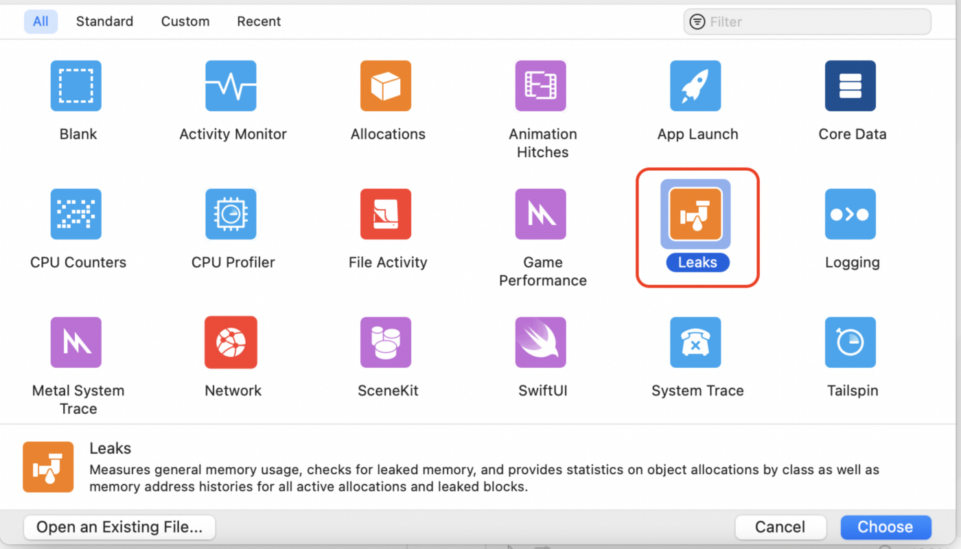 In the context of a closure, variables and constants from the surrounding scope are captured. This establishes a tight connection between it and the value required by the closure. In our project, it's probable that we'll have thousands of closures, which means that inspecting each and every one of them for memory concerns will be quite time-consuming. It is possible to monitor for memory leaks in Xcode; all that is required is to open Instruments and seek for the option Leaks.