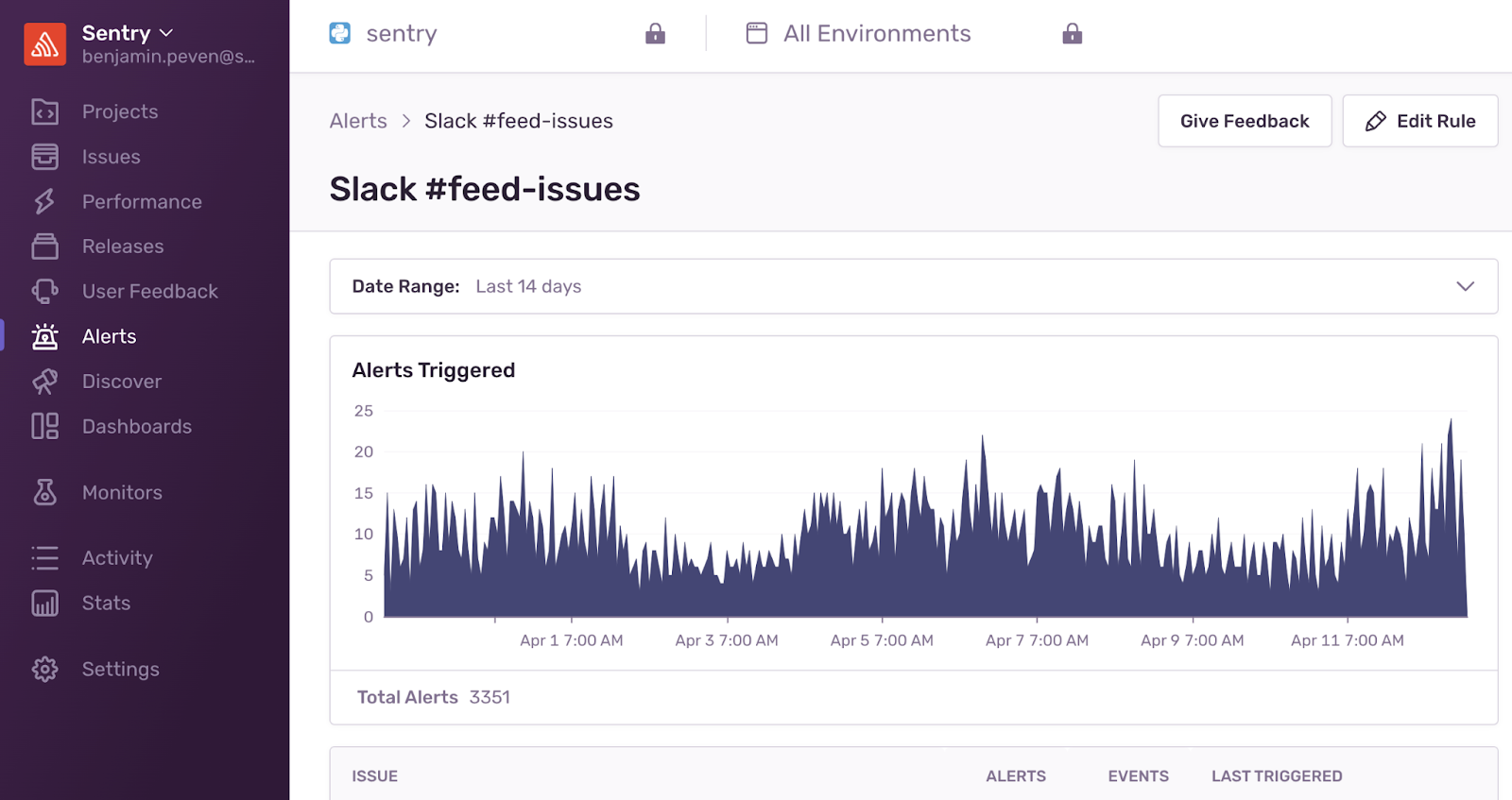 In the example below, I select an Issue Alert and see that the ReadTimeoutError Issue has triggered 104 alerts in the past 14 days. I may want to look into this error in the future, but in this case, these timeout errors aren’t worth waking up in the middle of the night for. To exclude these events from this Alert, I edit the Alert rule to exclude the ReadTimeoutError exception. Now I won’t receive any more timeout error notifications.