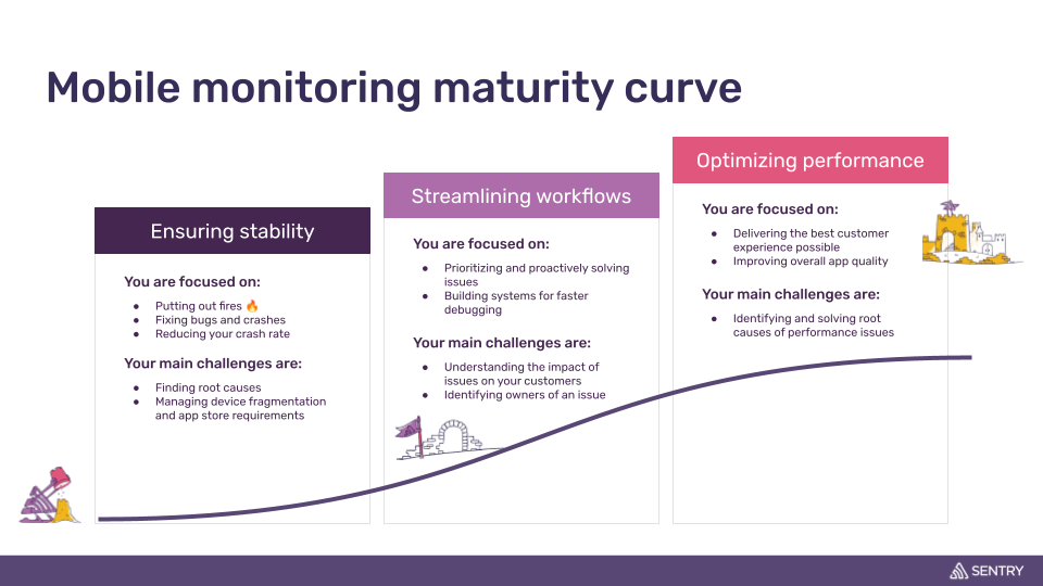 Based on our experience working with thousands of mobile developer teams, we developed a mobile monitoring maturity curve here at Sentry. We hypothesized that once teams achieved stability and were no longer firefighting and fixing crashes, they’d shift to streamlining workflows and eventually focus more on optimizing mobile app performance.