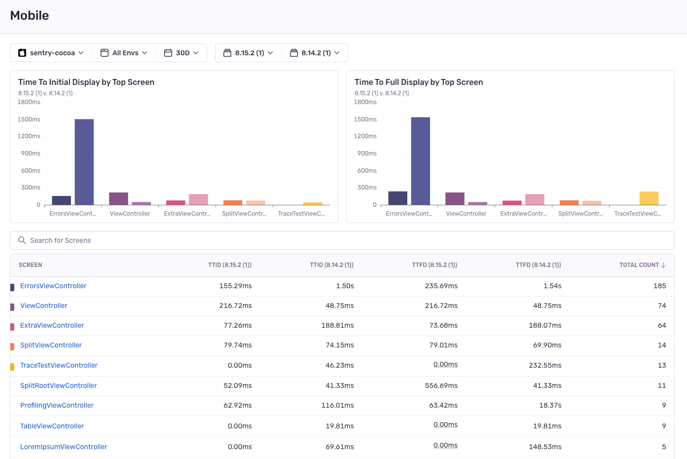 TTID and TTFD highlight work contributing to slow metrics in production. With Sentry’s Screen Loads, you can see user screens with the highest traffic and compare TTID and TTFD across releases. This can highlight potential performance bottlenecks introduced in new releases, so you can then investigate the code changes, dependencies, or assets causing the slowdown. (See screenshot below)