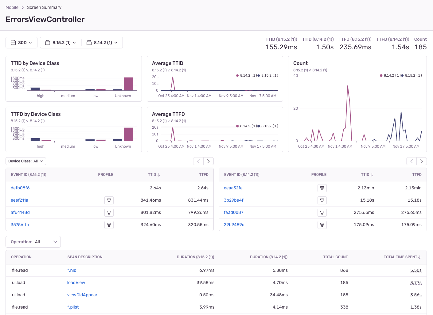 You can also look at screen load summary metrics for a single screen, plus filter by mobile device class and see the average TTID / TTFD across releases. Below the summary graphs, you’ll see the most time-consuming spans — for these, you can also filter by operations. This gives you the necessary context to know which operations are causing your TTID or TTFD to be slow (see screenshot below).