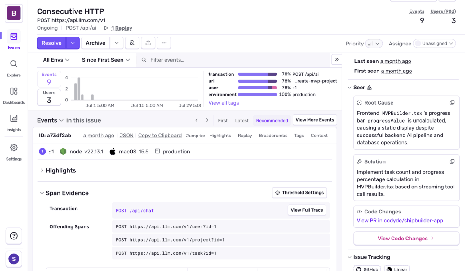 For example, if you’re building an app and during the onboarding process it might trigger a createUser request, then a createProject request, then send an individual createTask request sequentially. The tasks are independent, but the calls are chained — adding avoidable latency to the response stream. Sentry flags this as a consecutive HTTP request issue, with trace-level detail so you can parallelize the flow and reduce wait time.