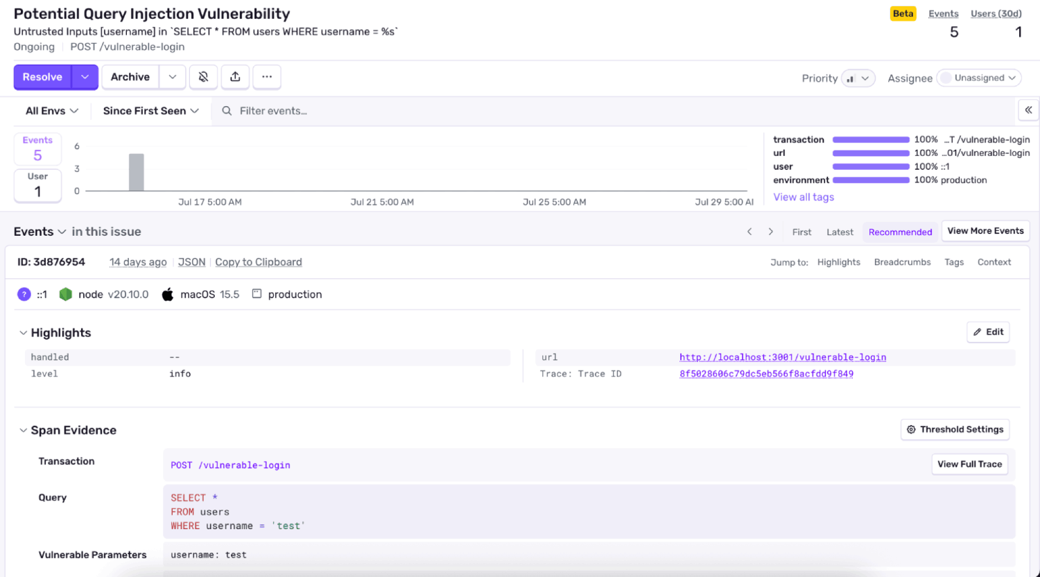 Sentry now detects these query injection issues by tracing how input flows through your code — from request to query — and raising an issue when we spot unsafe patterns like string interpolation, template literals, or raw values passed directly into queries.