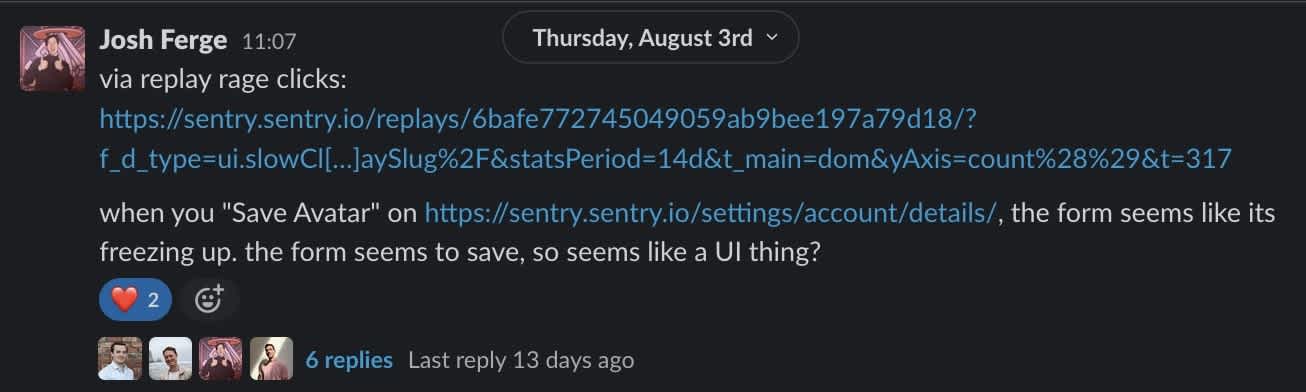 Here’s a simple, but fun one. Session Replay told us that several users were seeing a dead click when hitting “Save Avatar” on our account settings page. Turns out the page seemed to lock up after someone tried to upload a new profile picture.