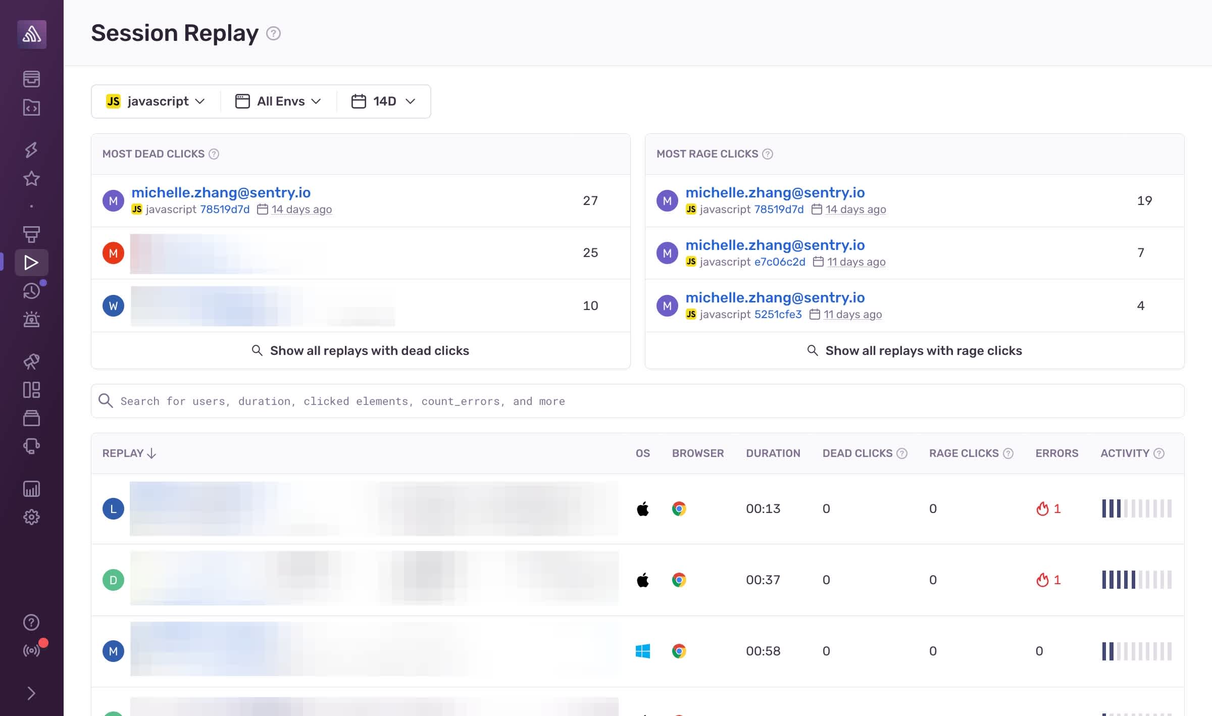 Enter Sentry’s Session Replay, a nearly literal window into the user’s experience. Through video-like reproductions of user sessions, Sentry shows you precisely what actions the user took and how your service behaved within this specific user’s environment. While this is great for several reasons, it still requires you to watch every session and then maybe you’d see someone shatter the glass on their trackpad. So we updated the Session Replay landing page to surface sessions with rage and dead clicks present, making it easier to identify those pain points in the UX.