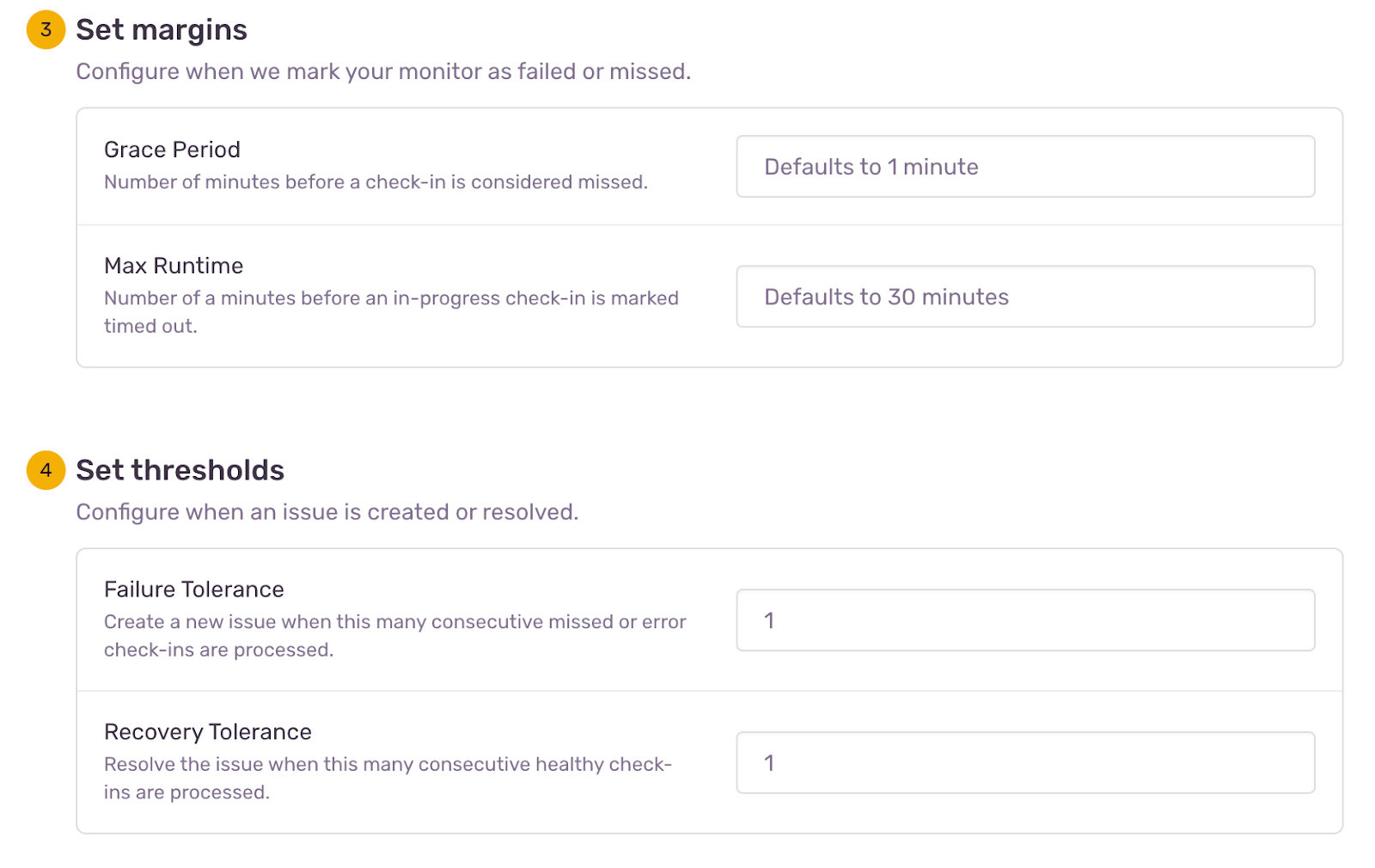 You can also define alerting parameters (i.e. Margins and Thresholds). The new Margins alerting feature tells Sentry when to mark a job as failed or missed, and Failure and Recovery Thresholds define when to create or resolve an issue.