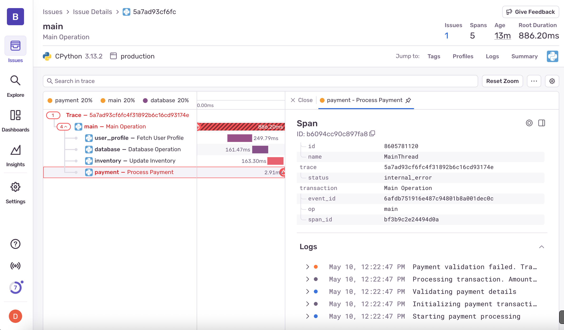 Sentry automatically links those logs directly to the issue, so when you’re staring at a payment failure error, you’re not starting from scratch. You’ll already have the surrounding logs that show what was passed in, what the upstream service returned, and maybe why your retry logic didn’t kick in.