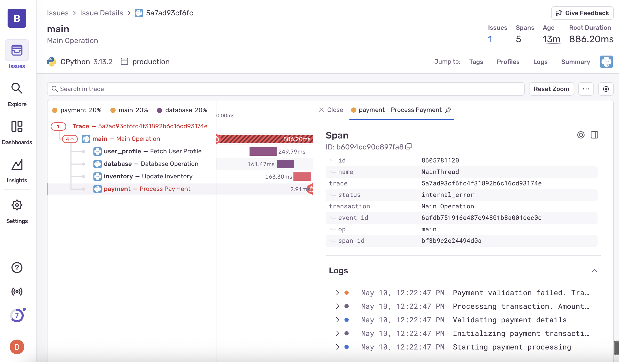 Sometimes things happen that don't trigger an error, like your app suddenly getting slower. While you've always been able to use Sentry's Tracing to see what happened across services and systems, now you can get additional context to see why it happened — with logs right next to the spans they relate to. So the next time you're investigating why your API calls are taking 10x longer than expected, you'll immediately see log messages about retry attempts, fallback paths, or state changes that your code handled without errors but at the cost of performance.