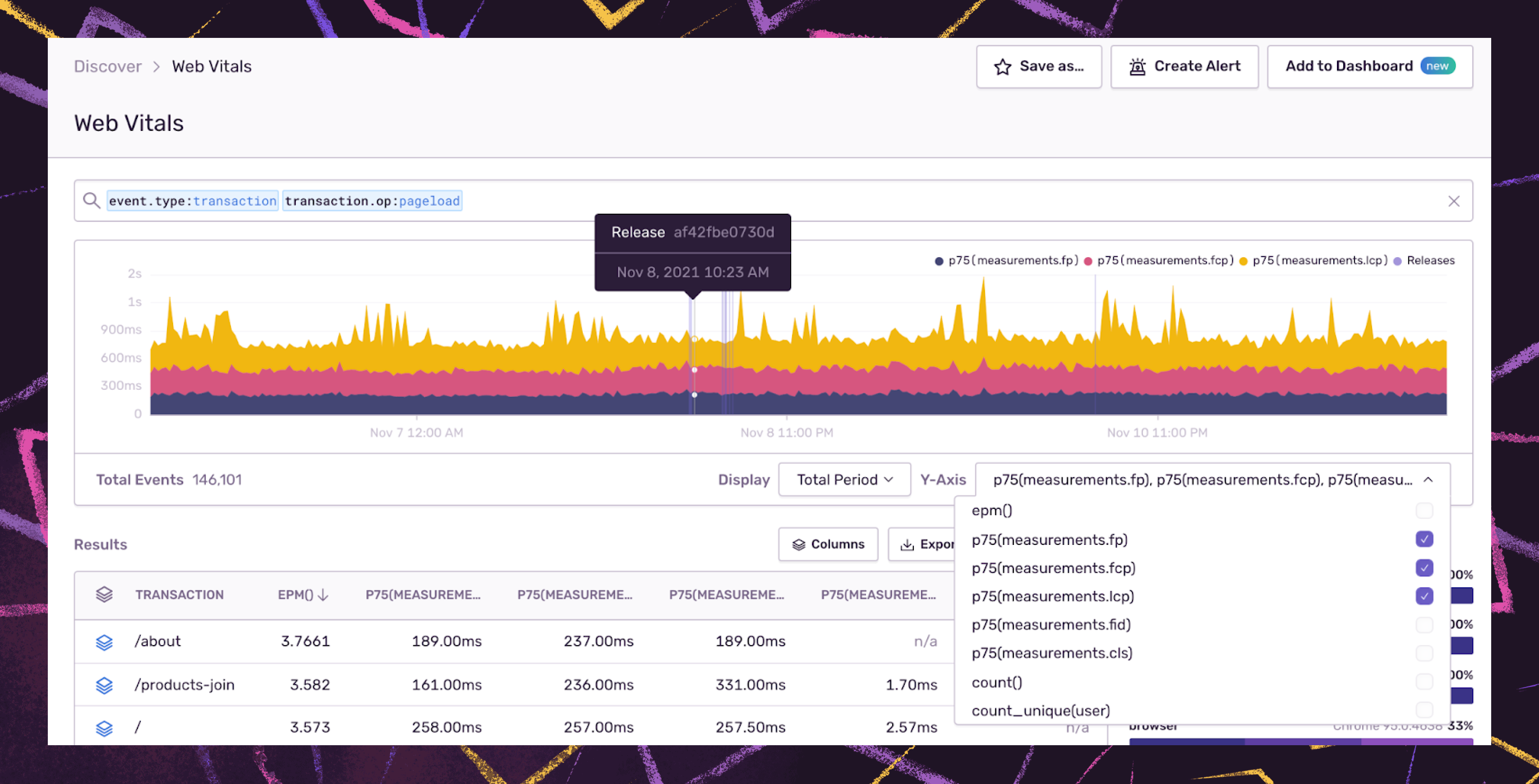 Additionally, you can display and plot up to three different Y-axis series for easy comparison in Discover. For example, you can monitor how a new release impacts frontend performance by adding release tags alongside your core Web Vitals - Largest Contentful Paint, First Input Delay, and Cumulative Layoutshift - to view layout shifts or latency spikes that impact the user experience.