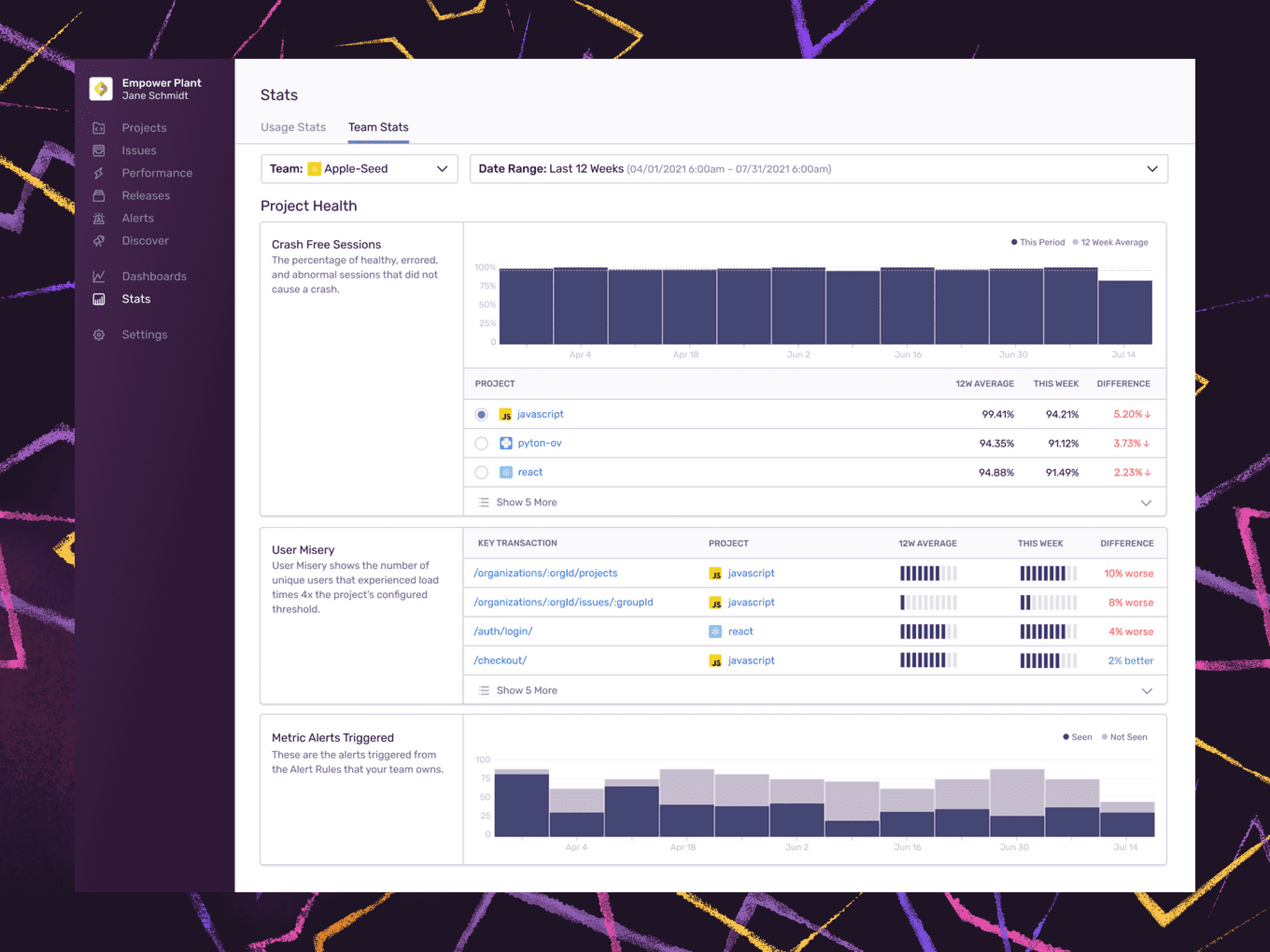 Team Stats gives you a cross-project view into your application health while tracking how your team's projects affect users with stats such as crash-free sessions and User Misery. You can also see how your team takes action on issues with stats like issues reviewed by project, the overall time to resolution, and the number of releases over time.
