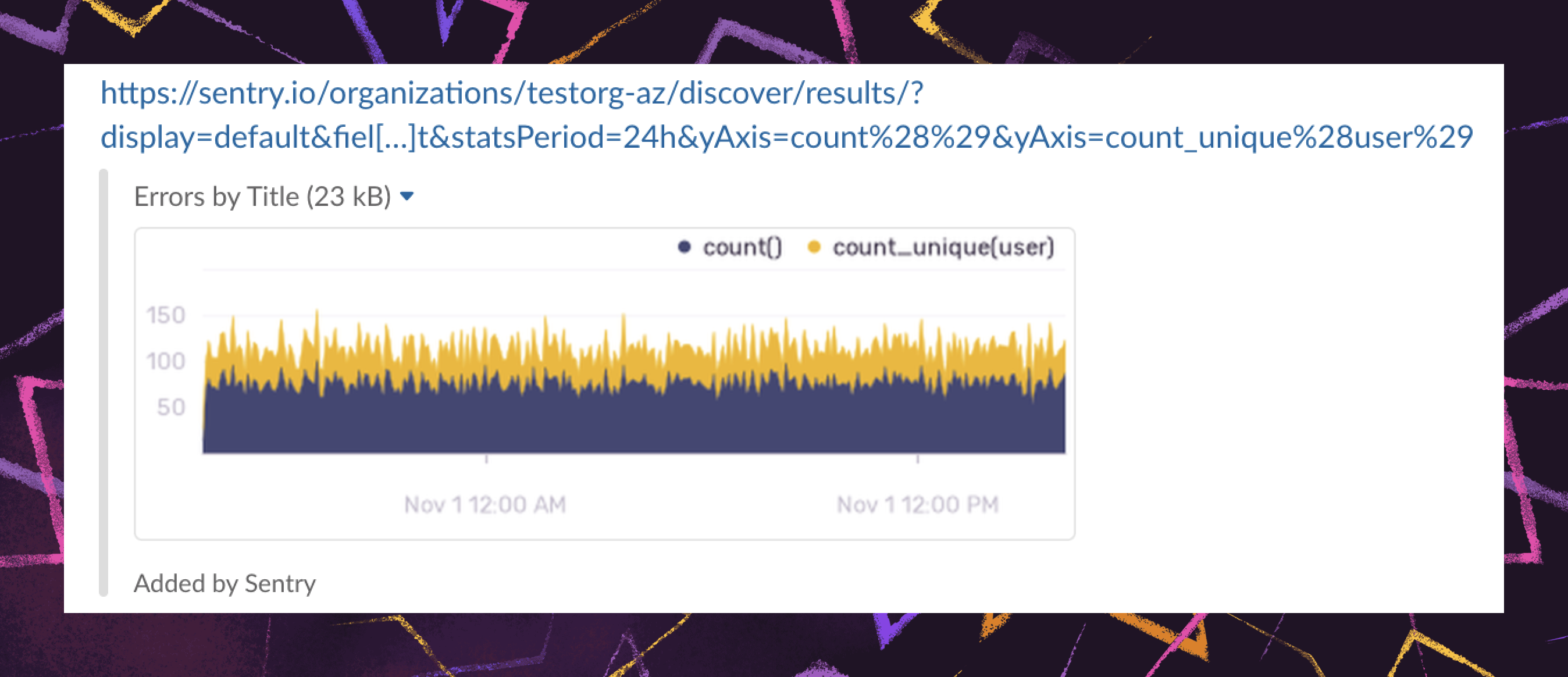 That’s why while we were busy making all the improvements outlined above, we also made it so Discover queries will unfurl in Slack. With chart unfurls, your team members can see and comment on charts directly in Slack without logging in to Sentry, adding context and continuity to your conversations. (From our dev team: Look, this was technically scope creep. So don’t tell our PM that we’ve been sandbagging story points, or we won’t be able to ship more little improvements like this.)