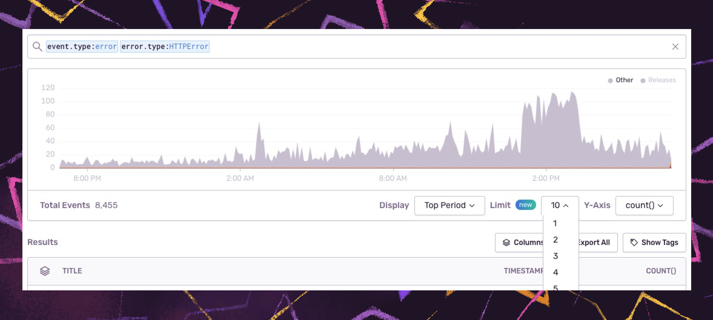 You can filter your chart down to the top 10 results according to fields like projects, transactions, issues, or even browsers within a given period by adding a stacking function to your query. By visualizing the top errors, for example, and how they compare to the rest of the results, you can quickly identify critical issues and anomalies across the organization and ensure the right team or individual takes action accordingly.