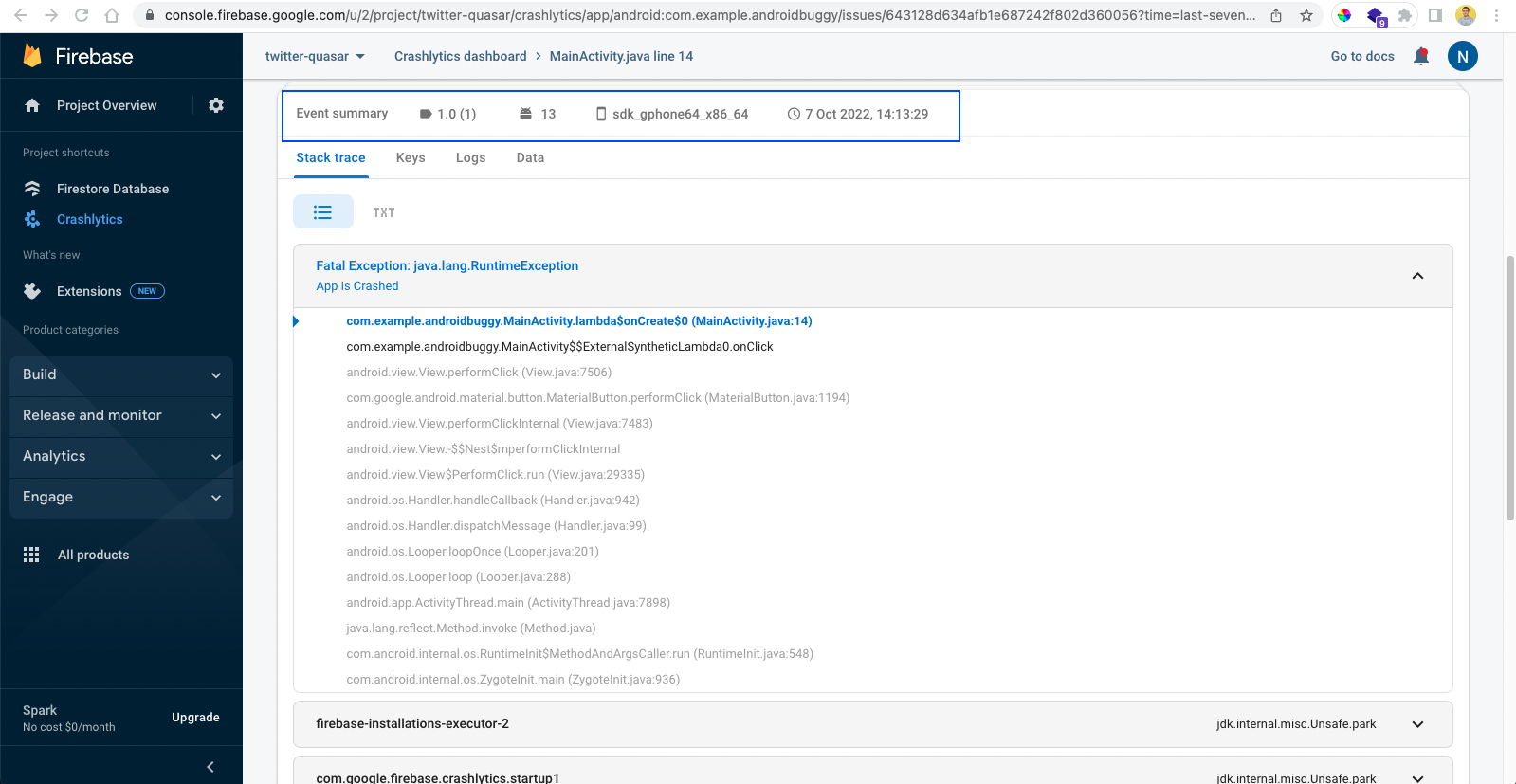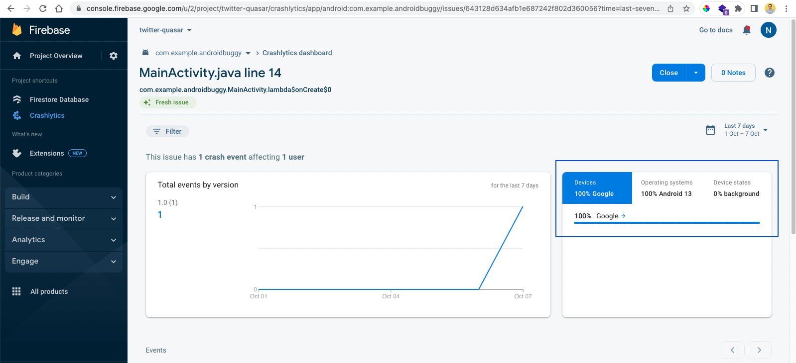 Firebase will show us the error with a lot of other metrics. Click on the displayed error.