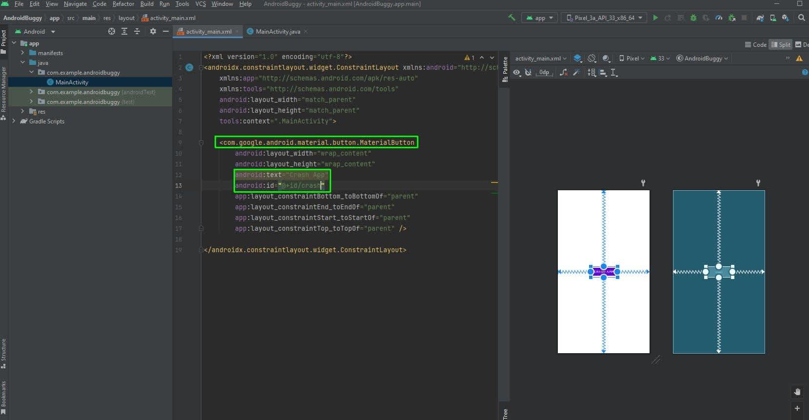 Now we are going to change the code a bit and add a MaterialButton. We'll also add text and id to it.