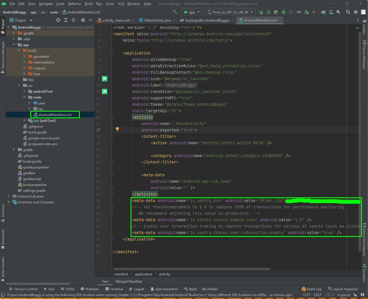 Now, we'll add the meta data containing our keys from Sentry docs in the AndroidManifest.xml file.