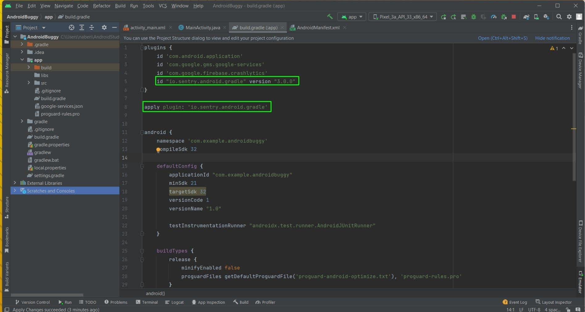 Back in the module build.gradle file in Android Studio, we need to add a plugin for Sentry.