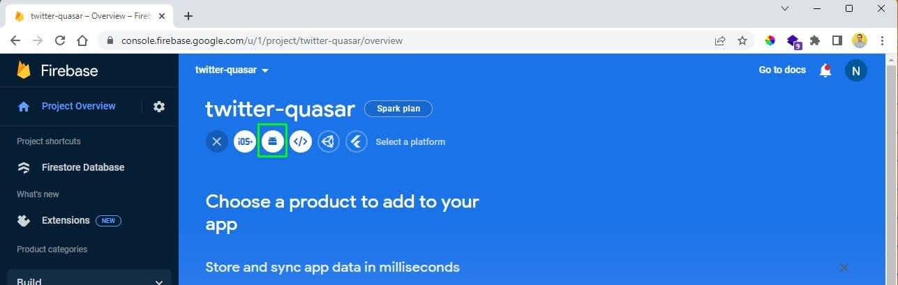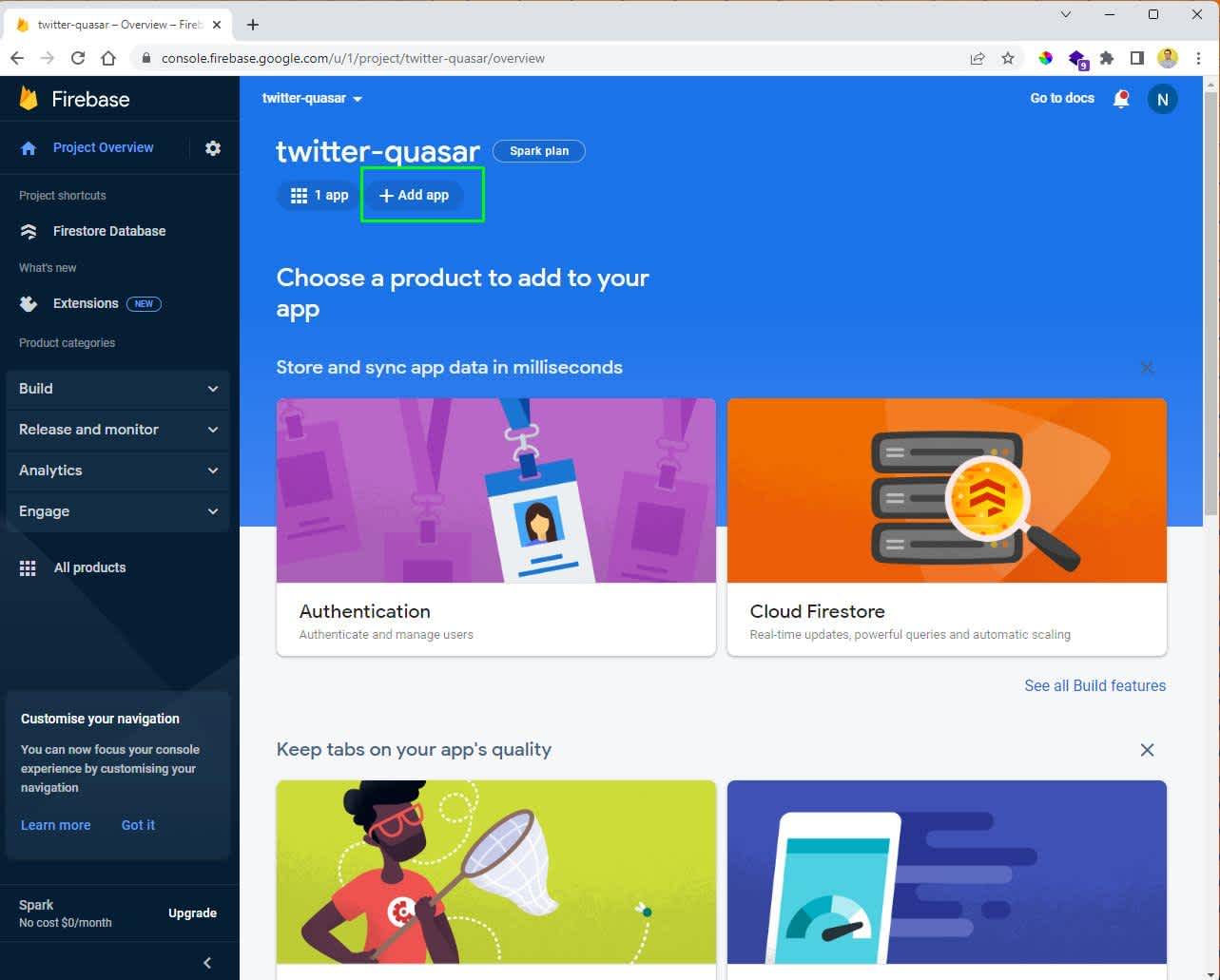 We can create a new app in Firebase or add an existing app. We are going to do the latter. To accomplish that, after opening our existing app, click on + Add app.