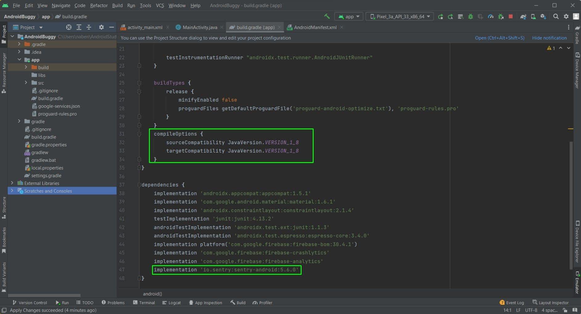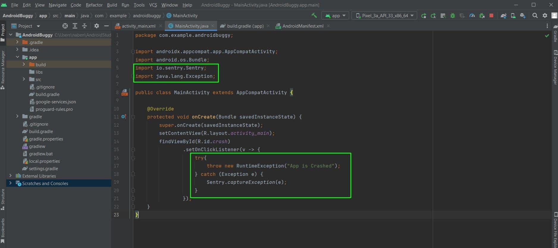 Finally, we will refactor our code in the MainActivity.java file. Here, we are importing Sentry and using it in a try...catch block.