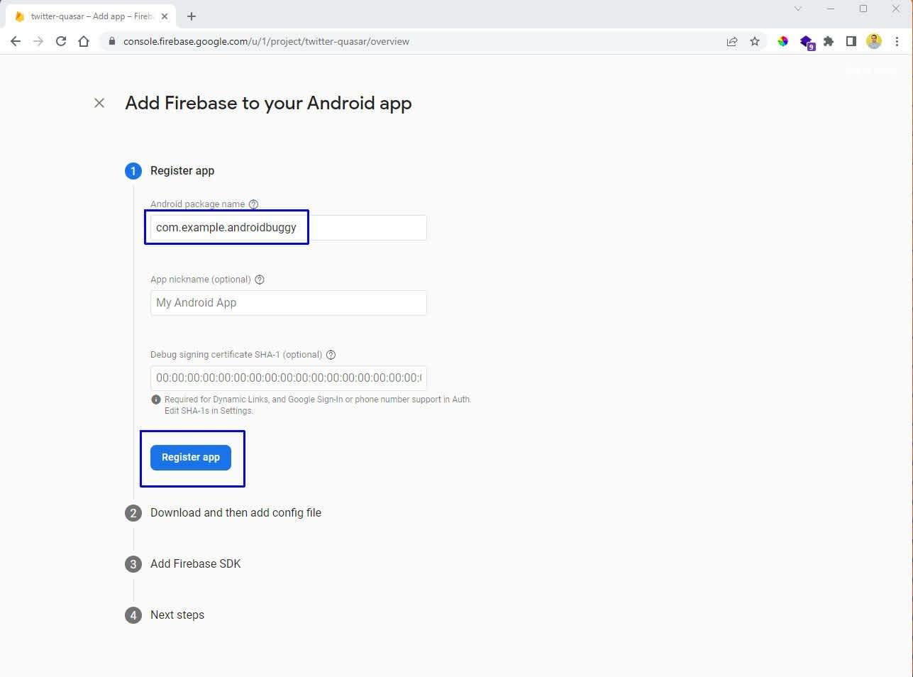 Next, we need to register the app. Here, in the Android package name, give the exact name of the Android app created earlier. Then click on the Register app button.
