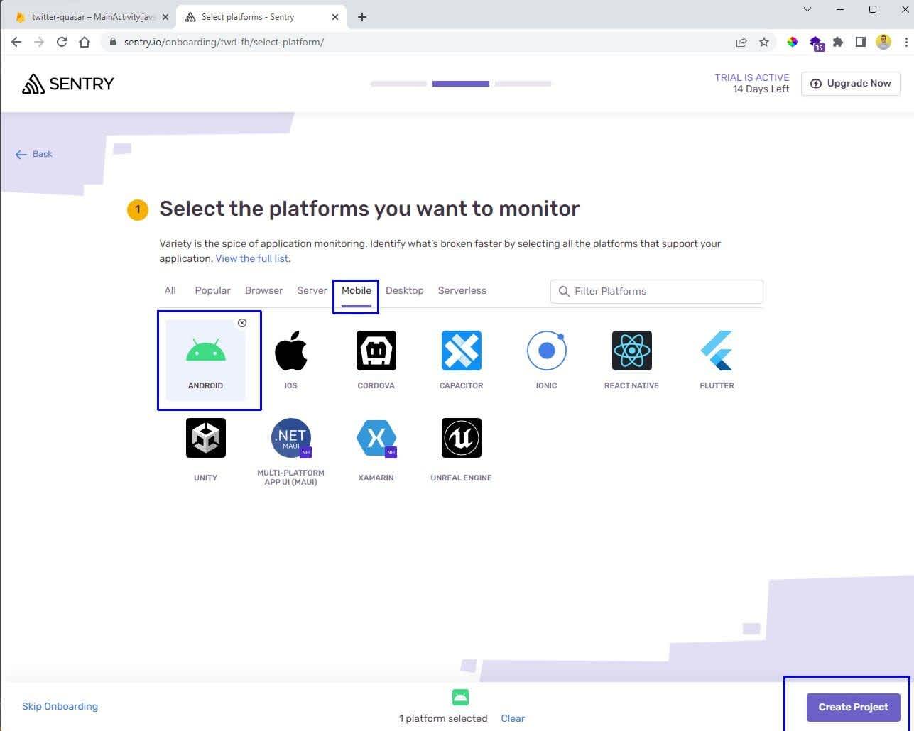 After you create a Sentry account, you'll be on your way to setup. Sentry supports nearly every major language and framework. We'll want to setup an Android project.