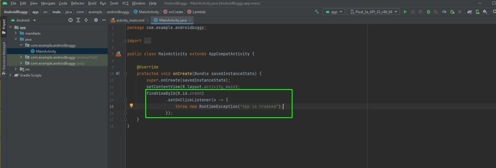 Next, open the MainActivity.java file and add a new in-built function, findViewById. Here, we are taking the id of crash and hence selecting the button. After that we are adding a new click listener. Here, we are just throwing an exception.