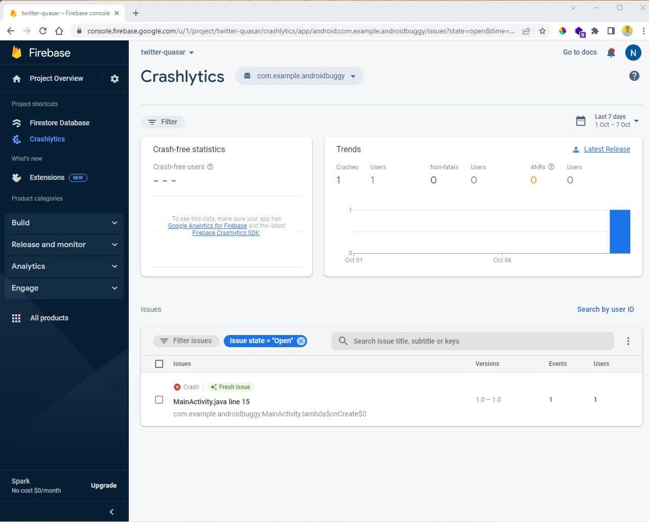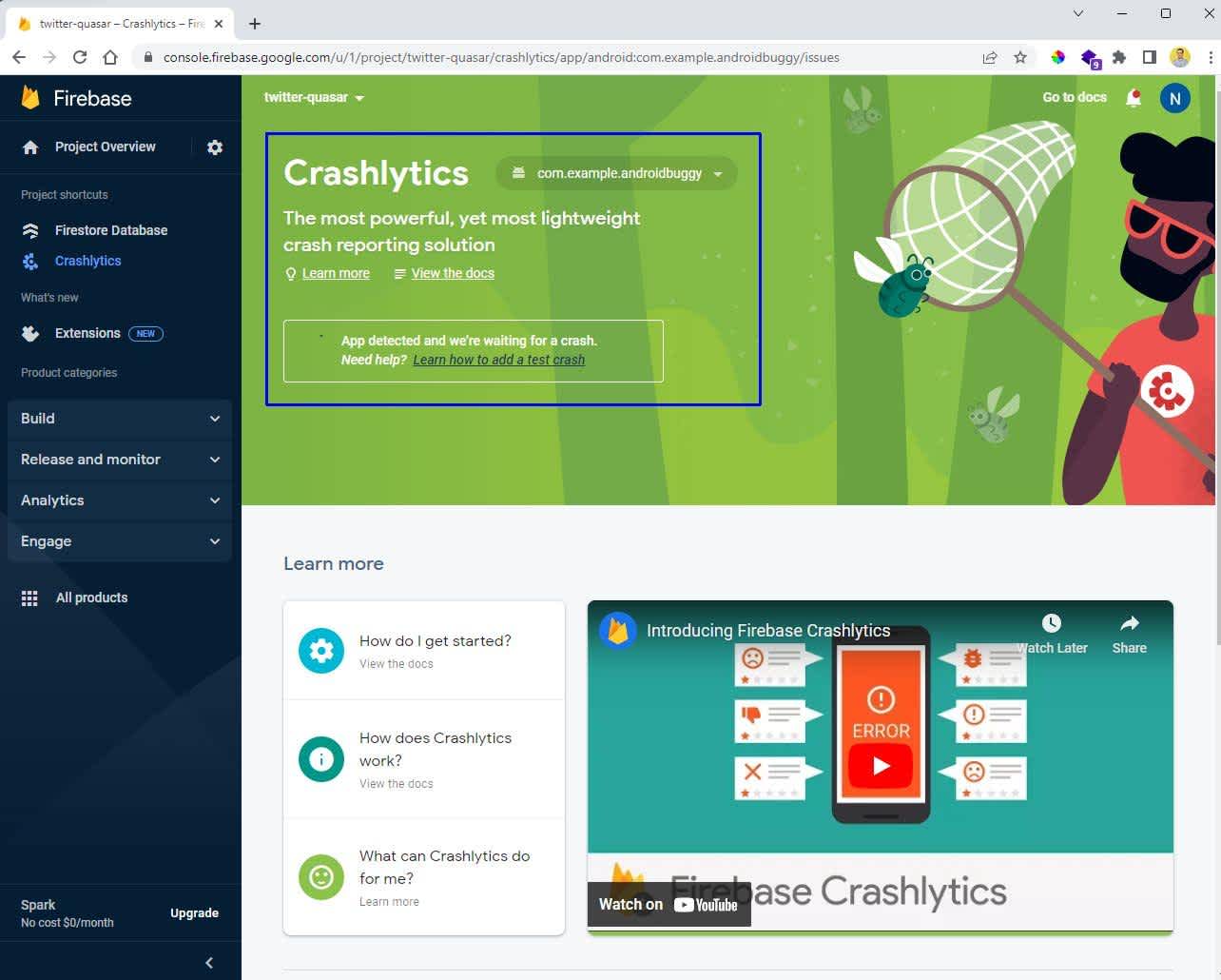 Now, in the Firebase Console, go to Release and monitor and then click on Crashlytics. Here, you will see that the app has been detected and is waiting for a crash.