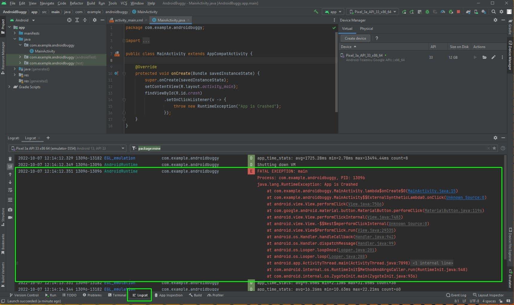 We will first look into checking the crash reporting by using Android Studio. Logcat is a good feature that will help us investigate the mobile crashes.