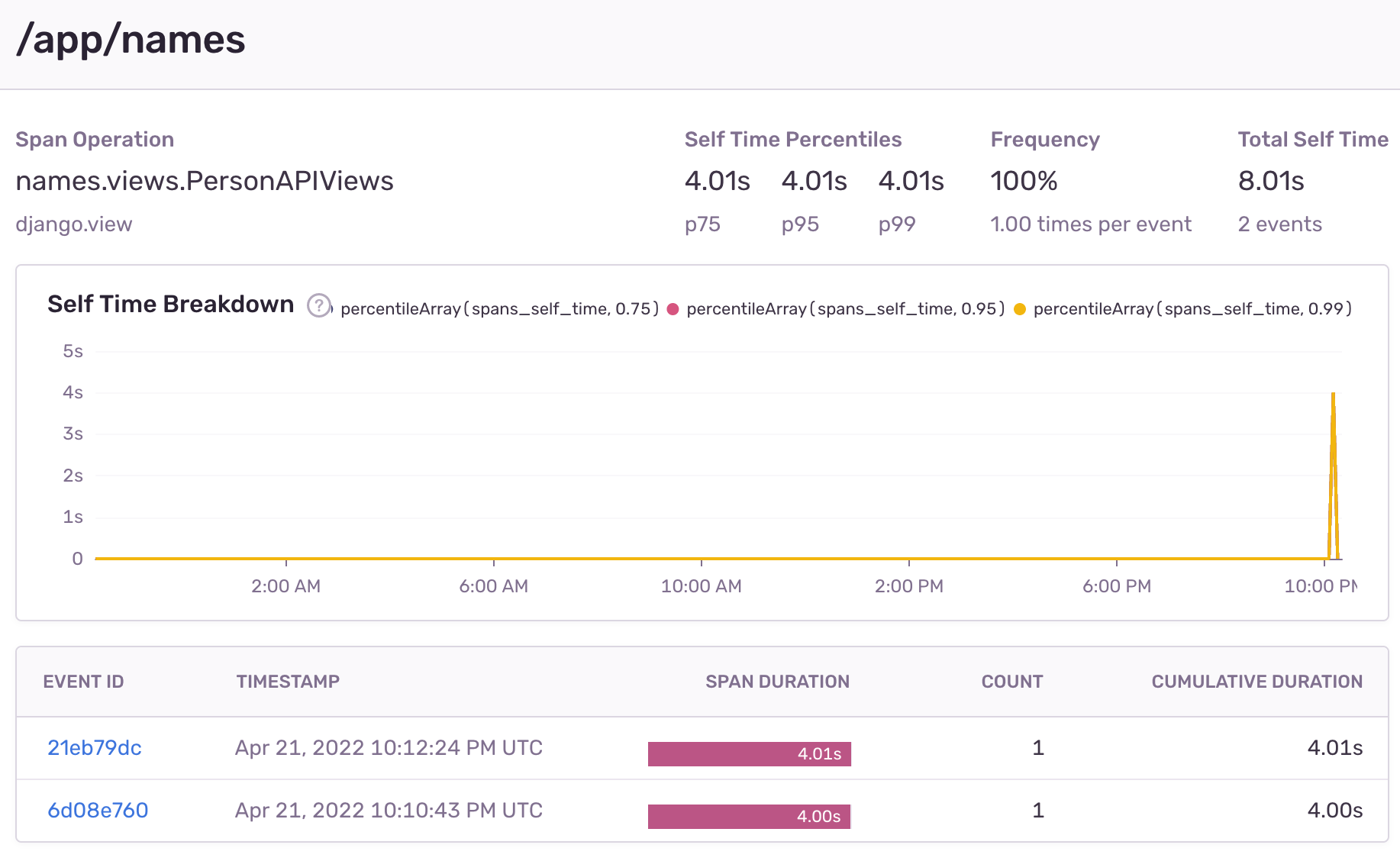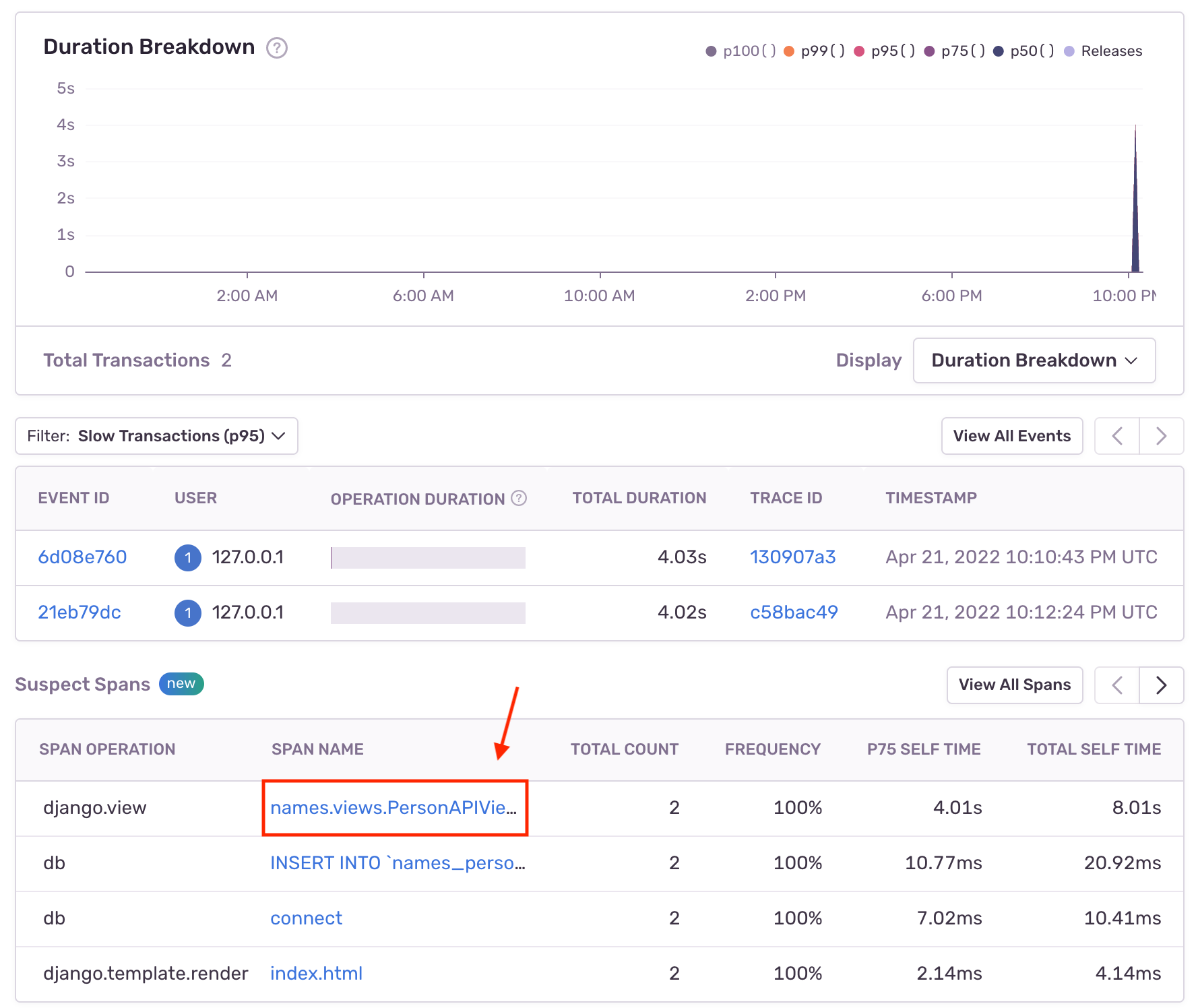 Click on "names.views.PersonAPIViews" under "Suspect Spans" and you'll be given another view detailing the span's duration.