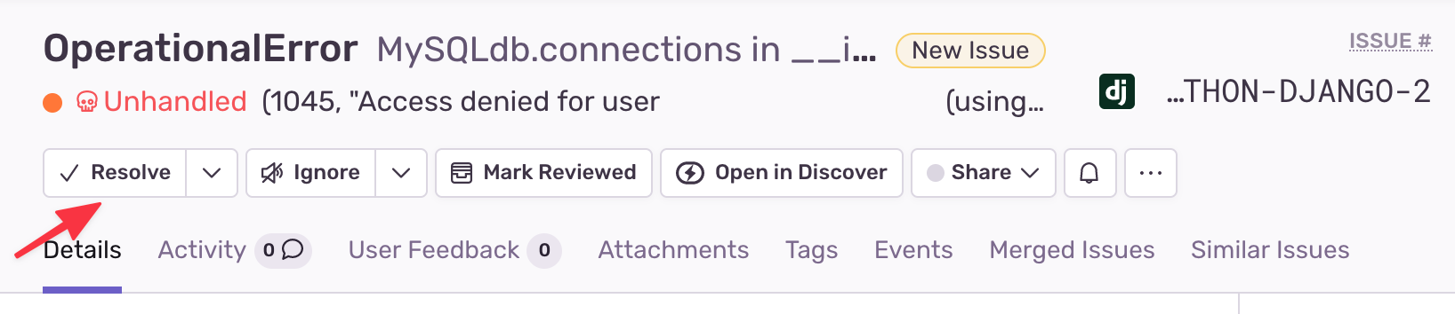 If the restart went as expected, we can mark the error as resolved on Sentry’s "Issues" tab by clicking on the "Resolve" tag on the upper-left section of the page.