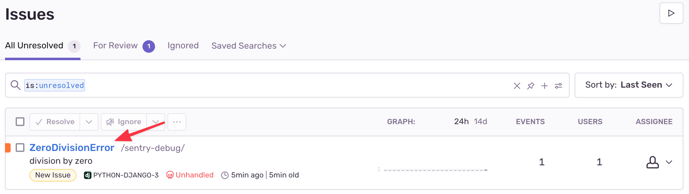 Return to your Sentry console and take a look at the error in your "Issues" tab. You'll notice the issue name is displayed in blue.