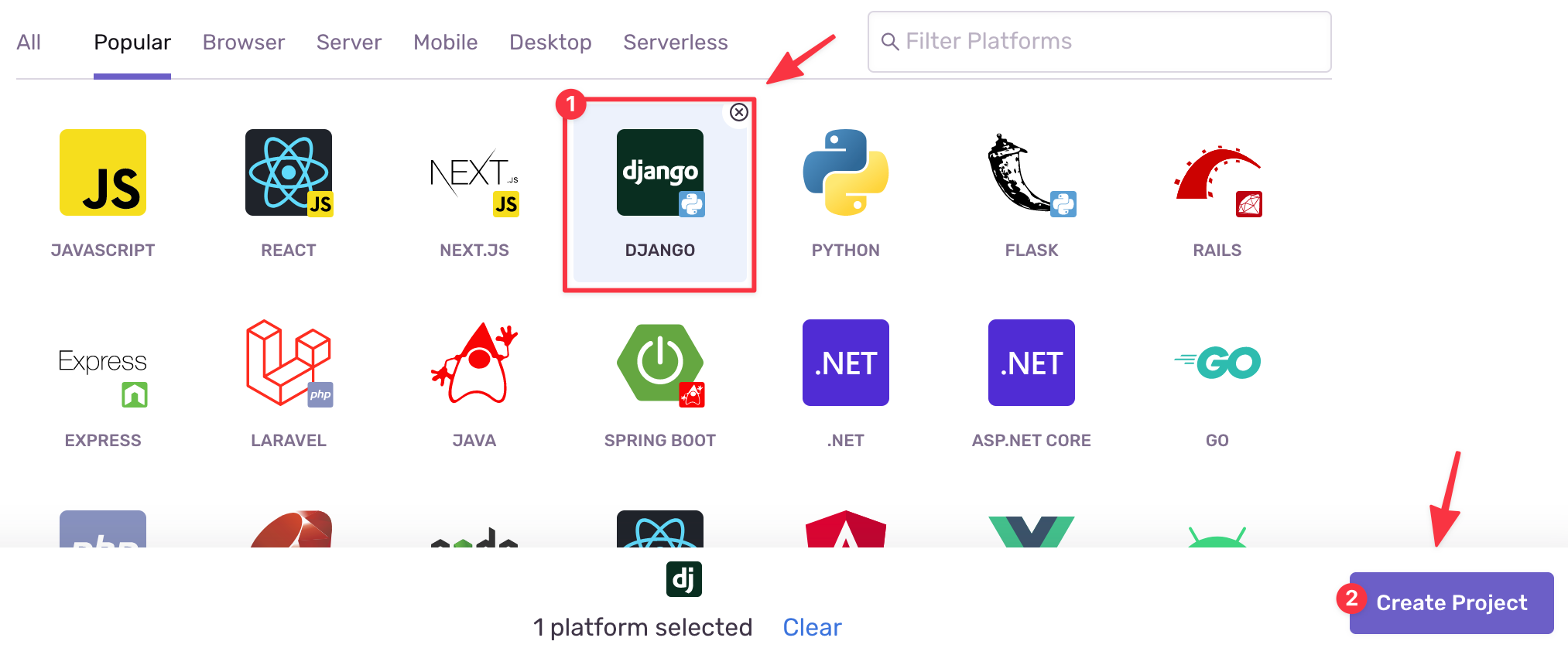 Click on the "Start" button, after which you will be taken to the "Select Platform" page. Select Django and click on the "Create Project" button.