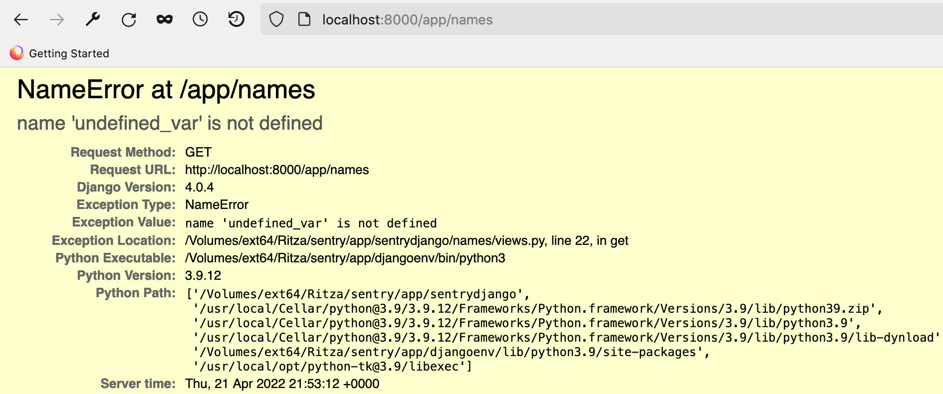 The last error we’ll test for is an “undefined” error. Open the names/views.py file and modify the get method to reference an undefined variable like so: