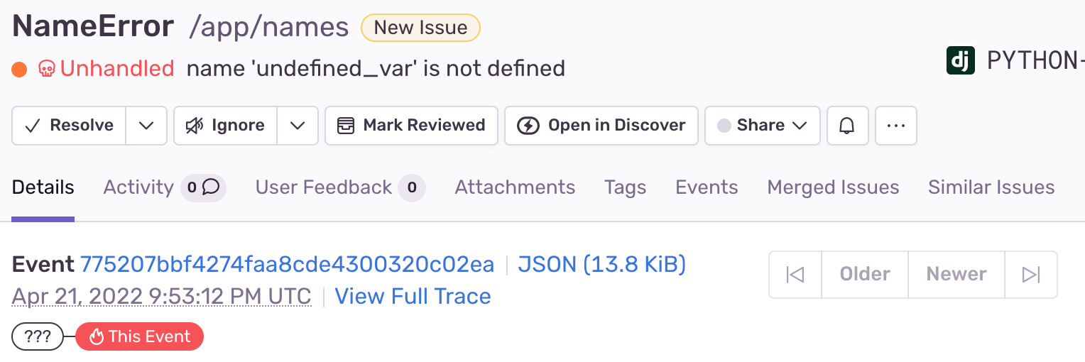 This confirms that we added Sentry correctly and that it’s working as expected.