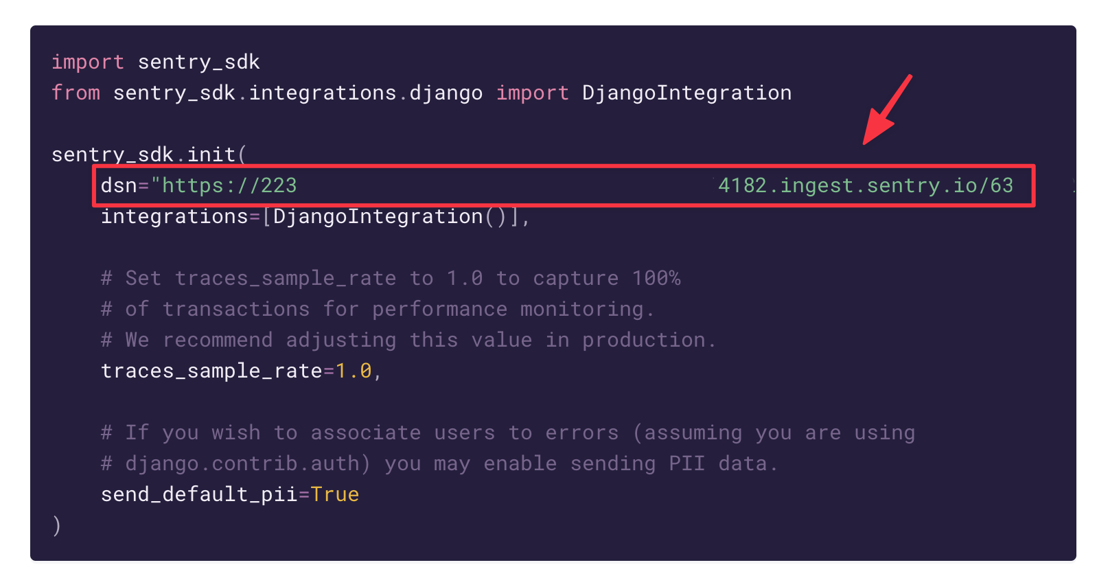 )Take care to replace the dsn value with your own. Find your dsn value on Sentry’s "Prepare the Django SDK" page still open in your browser.