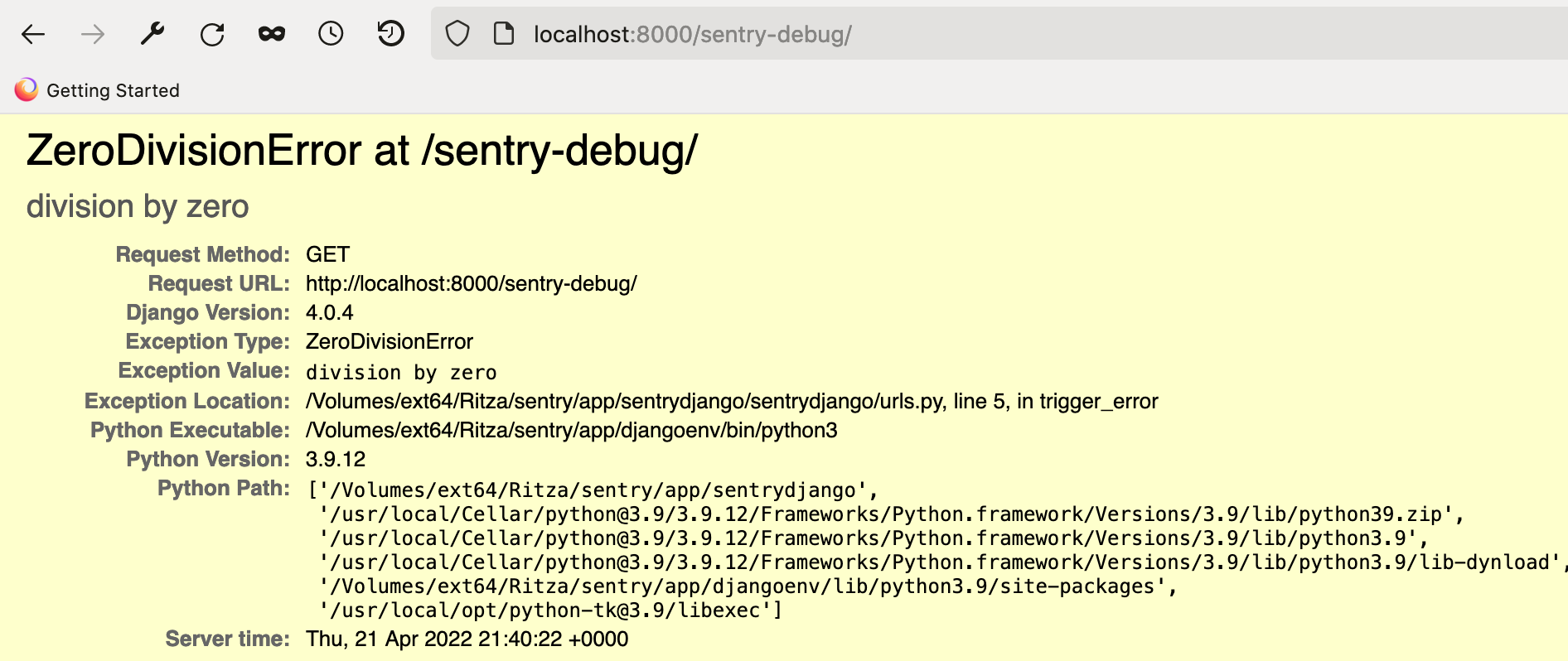 To demonstrate how Sentry handles zero division errors, visit the http://localhost:8000/sentry-debug route in your browser. There you should see the following error: