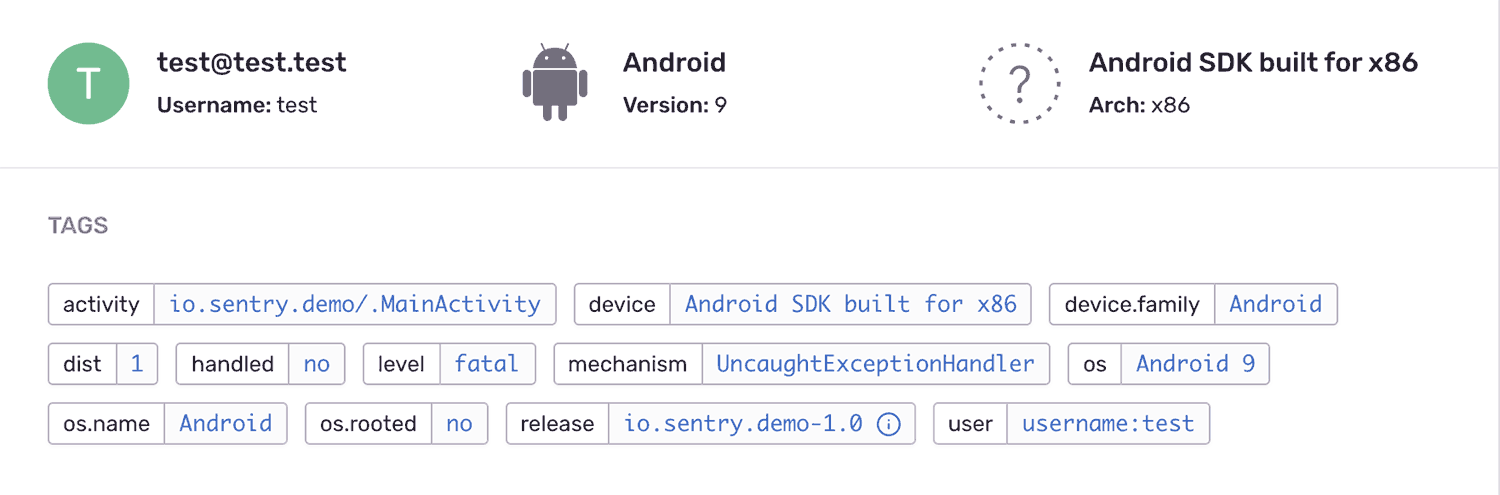 }Once the error reports are grouped into issues, you can see a distribution of the tag values from all relevant crash reports in Sentry’s UI.