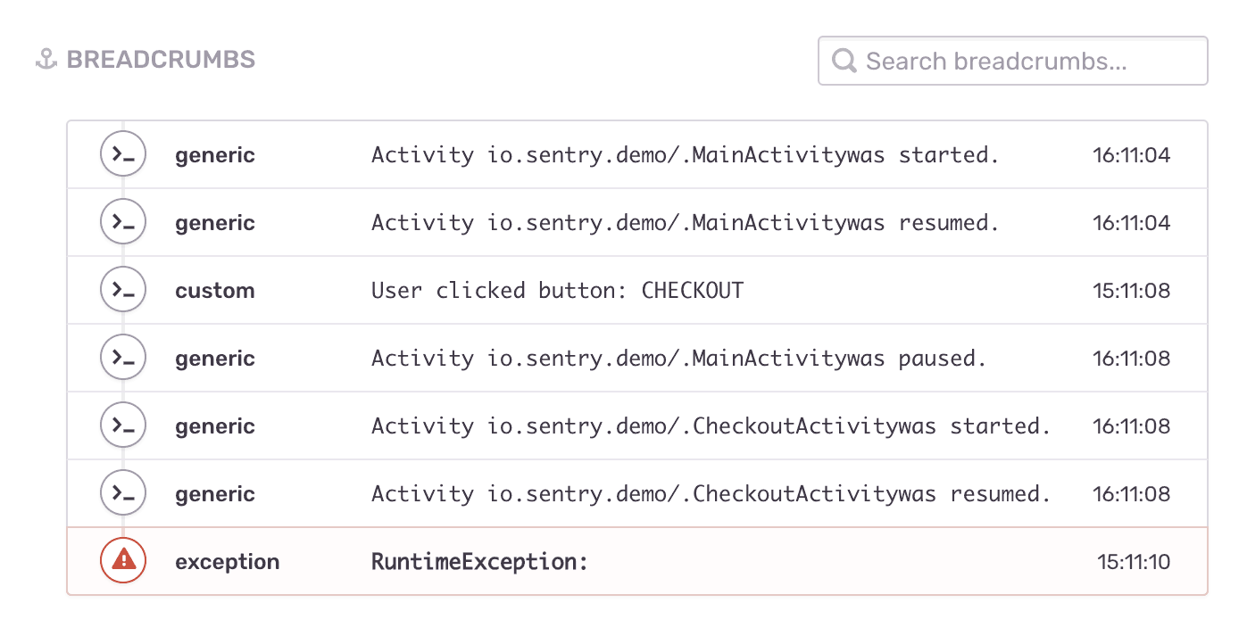 Sentry.addBreadcrumb(new Breadcrumb(“Activity ”