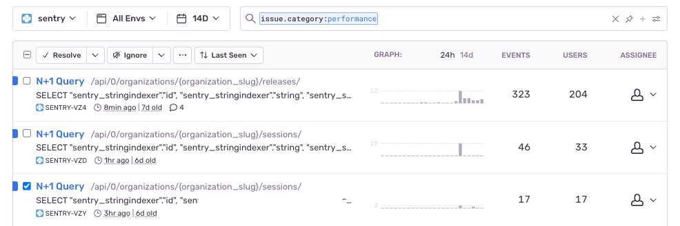Similarly to an Error Issue though, Performance Issues can be assigned, ignored, resolved, and searched for in the issues feed. You can also filter and prioritize by event count or number of users impacted.