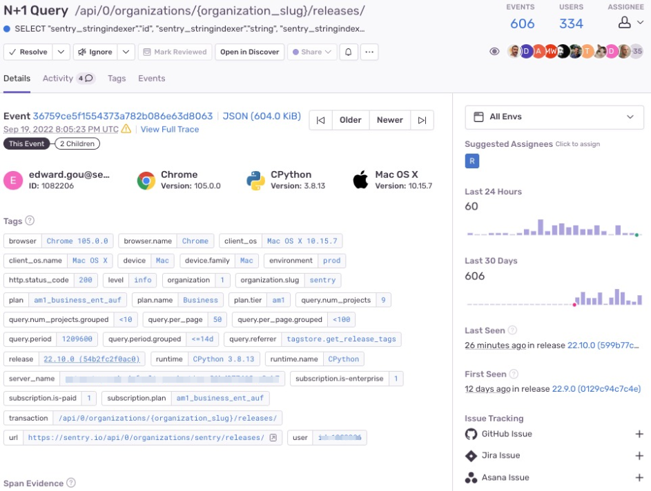 We actually wrote a blog post about an N+1 query problem of our own that occured in our backend – the query executed 15 times and added an additional 380ms. We were able to catch it early (before it got out of hand) by using Sentry Performance.