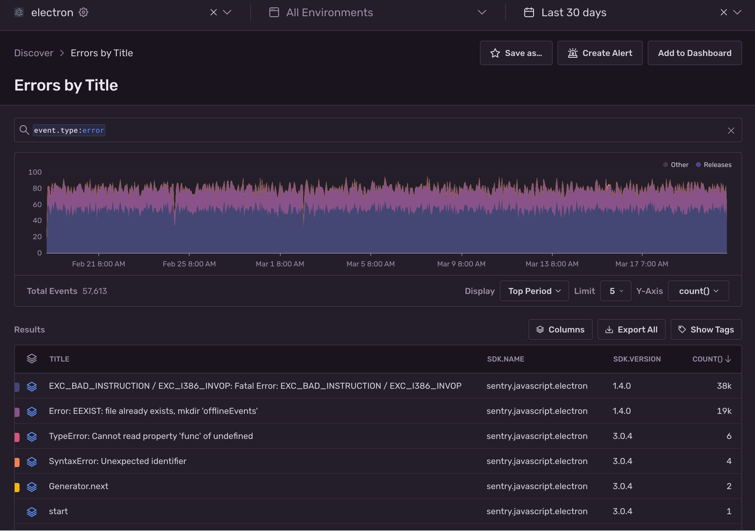 While Electron makes it easy to build cross-platform applications, maintaining them is a whole other thing. You need to be aware of OS-specific challenges, the machines your applications are running on, and their configurations. Version 3.0 of our Electron SDK helps you get a handle on all these unknowns with more context on every error, insight into when a release starts to degrade, and enable distributed tracing to easily see where the most time in a transaction is spent.